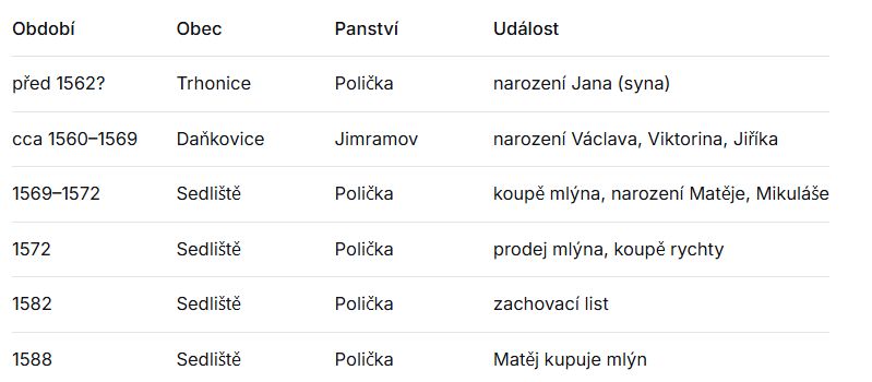 Pouze na základě této jediné listiny lze s jistotou konstatovat, že Jan a Markéta se do roku 1582 stali rodiči šesti dětí a že se narození potomků postupně odehrávala ve třech různých obcích.