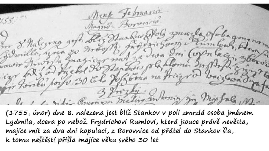Osmého února 1755 našel obecní pastýř Jakub u cesty mezi Borovnicí a Stankovem postavu.
