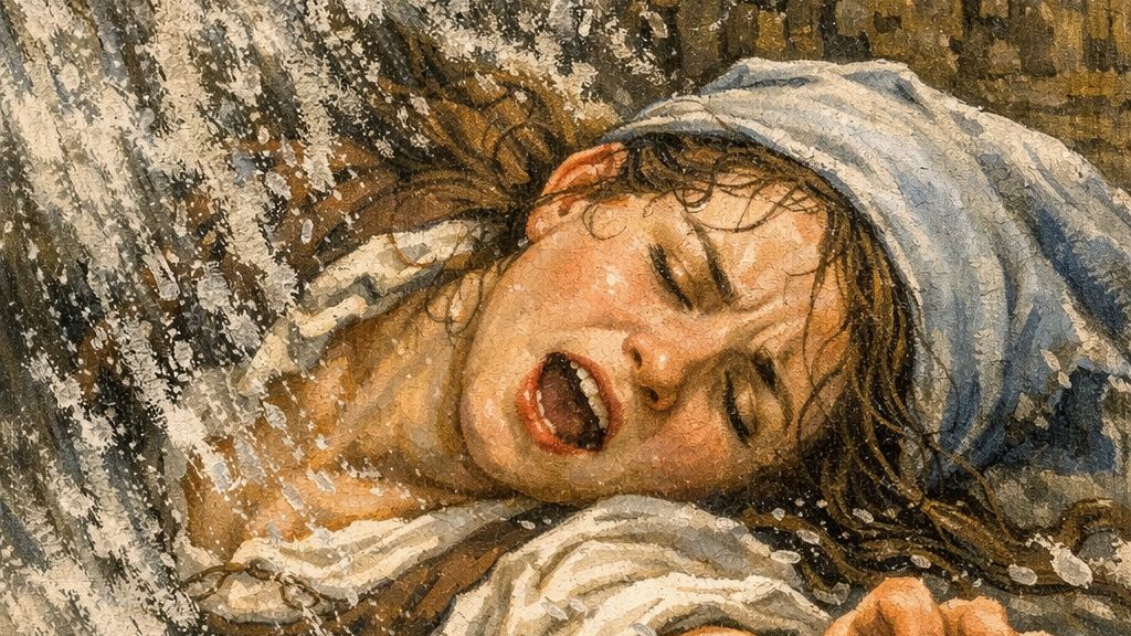 Kateřina se na ní na okamžik zastavila. Možná si upravit šátek. Možná se jen na chvíli opřít o trám.