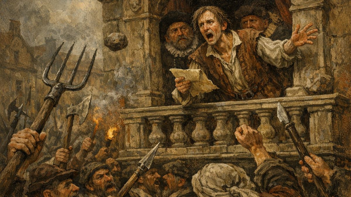 Teď, když se rozvášnění poddaní hrozící vidlemi, holemi, sekerami a všeličíms dalším všemi čtyřmi rohy vevalili do náměstí, vystrčili radní na balkón písaře. Hluk vzrostl, i kameny létaly a hubený, poděšený chlapík se jej marně snažil překřičet. Když už tam stál dlouhou dobu, lidé se postupně utišili. Vyslechli si poselství pánů radních, že mají poslat zástupce, s nimiž bude městská rada jednat.