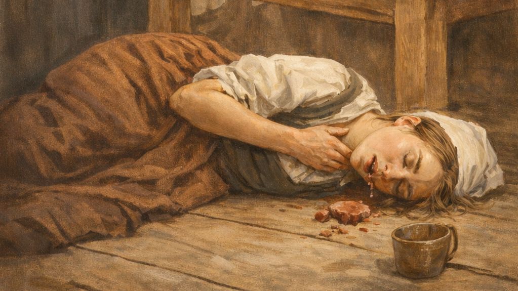 Lze si tu scénu představit: mladá, možná hladová služka dostane příležitost sníst kousek masa, který zbyl a tajně si ho dopřeje v koutě kuchyně. Ve spěchu a strachu, aby nebyla spatřena, sousto špatně polkne. Následuje panika, marný boj o dech a konec.