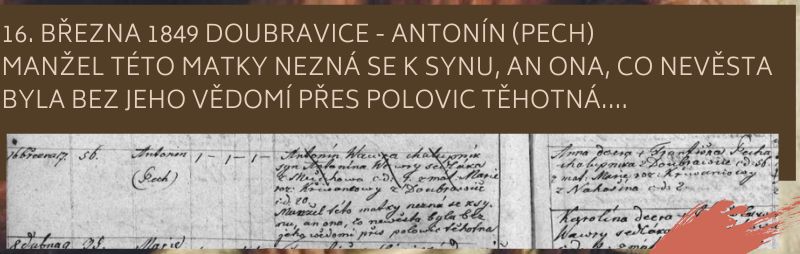 Pero zaškrábe. Zápis je hotov. Dítě Anny, manželky Antonína Pecha z Doubravice. Bez jména. Bez otce. Zápis hanby se naplnil. Kmotři pokývají hlavami, ne slovy soucitu, ale úředního potvrzení. Je hotovo.