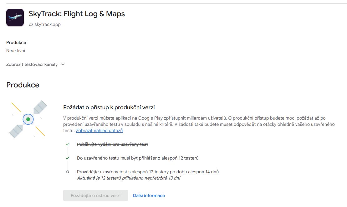Poté, co aplikace byla aspoň 14 dnů v používání u aspoň 12 testerů, můžete Google požádat o přístup k produkční verzi. Ano, přístup není nárokový a musíte vyplnit ještě jeden formulář… Schválení/zamítnutí může trvat až několik dnů. Po něm můžete přemigrovat stávající verzi z uzavřeného testování nebo nahrát novou.