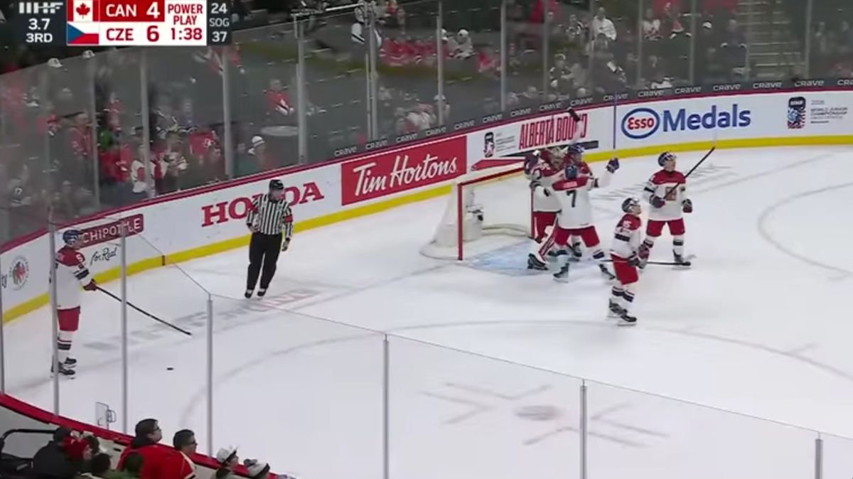 3. třetina: v závěrečných dvaceti minutách se děli opravdu velké věci a jen doufám, že kardiaci, kteří tento zápas sledovali jsou v pořádku. V čase 3:59 český tým nevěnoval dostatek pozornosti kanadskému útočníkovi, konkrétně to byl Cole Reschny, který si s kotoučem najel před českou branku a kupodivu lehce zakončil 3:3. V čase 9:49 se ale po přihrávce Václava Nestrašila do útočného pásma nádhernou individuální akcí se zakončením pod víko kanadské branky postaral Vojtěch Čihař a Česko se po třetí v zápase ujímá vedení 3:4. V čase 17:19 bohužel česká obrana zaspala a nejrychleji se před českým brankářem zorientoval Porter Martone, který neměl tolik práce posunout kotouč do české branky 4:4. Naši hokejisté se ale nevzdávali a bojovali stále dál a v čase 18:46 se po nepřehledné situaci před kanadskou brankou dostal kotouč po odrazu od brusle Tomáše Poletína za brankovou čáru 5:4 pro Česko. V závěru se ještě Kanada pokusila hrou bez brankáře, ale jelikož byl zároveň na trestné lavici Cole Reschny, byl počet hráčů sice vyrovnaný, ale Kanada s dohrávala s prázdnou brankou, do které v čase 19:34 uklidil kotouč Vojtěch Čihař a poslední změnou skóre na 6:4 poslal český tým do finále! V závěru si ještě vykoledoval Gavin McKenna dvě minuty za nesportovní chování. Český tým tedy po třetí za sebou přerušil kanadským juniorům možnost hrát o nejcennější kovy šampionátu…