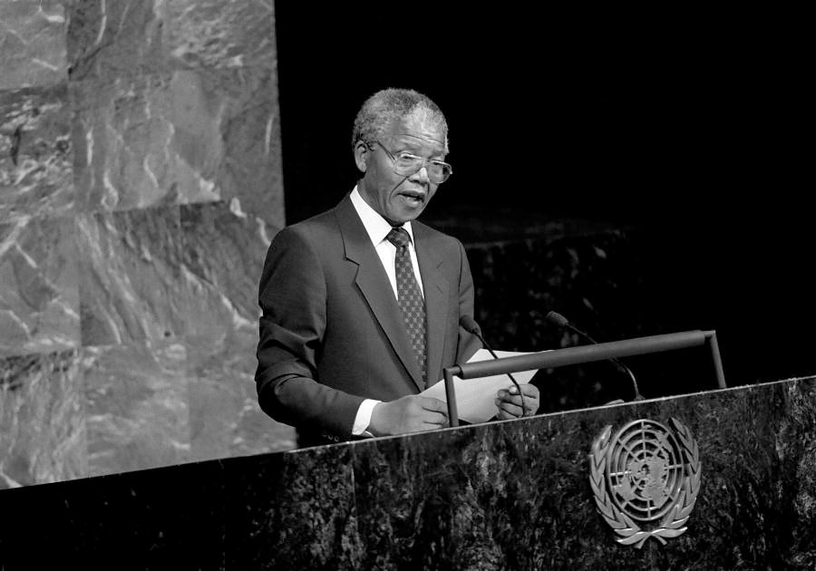 Nelson Mandela, místopředseda Afrického národního kongresu Jižní Afriky, vystupuje na zasedání Zvláštního výboru proti apartheidu v sále Valného shromáždění OSN. 22. června 1990. Foto OSN / P. Sudhakaran