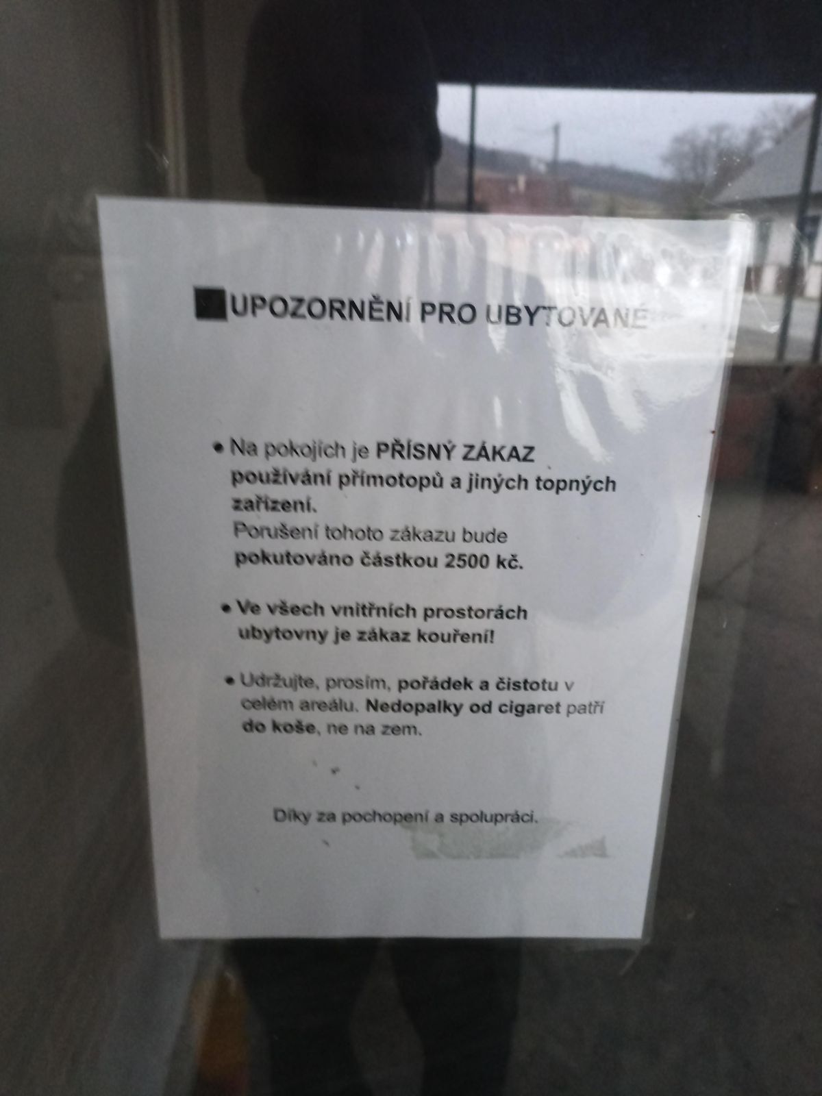 Přímotop si do pokoje dát nesmíte, to má majitel vylepené přímo na dveřích ubytovny a porušení je pokutované 2500 korunami. Jako chápu to a rozumím tomu, že třeba nechce riskovat požár kvůli vadnému topidlu a utrácet navíc za elektriku, jenže lidi v jeho zařízení fakt mají právo nemrznout, protože jinak by si mohli venku postavit iglú a ušetřili by za nájem.