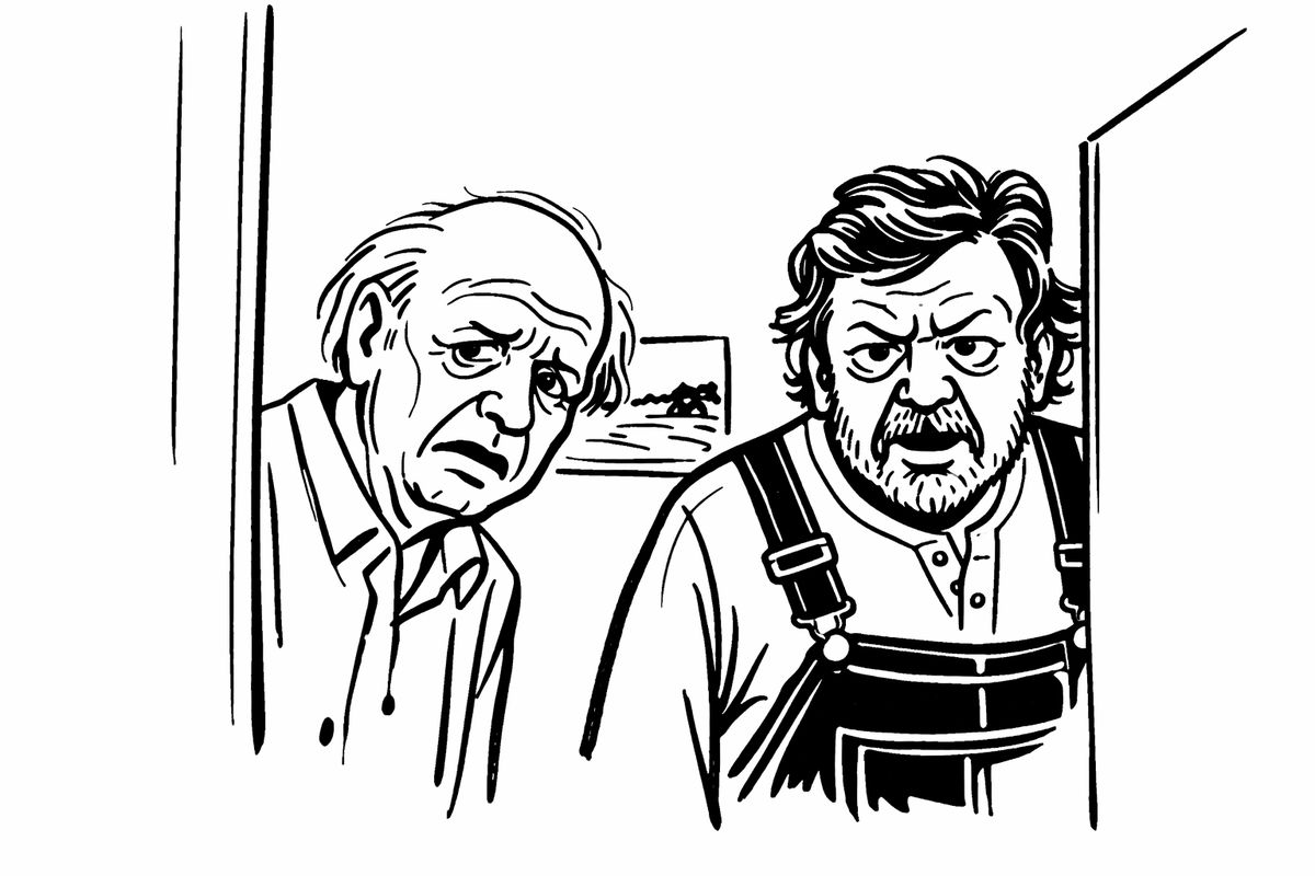 Karikatura jedné scény z filmu „Stoletý stařík“. Alan Karlsson (ten vlevo, hraje ho Robert Gustafsson) a jeho nový parťák právě zjišťují, že zapomněli na vetřelce, jenž Alana pronásleduje kvůli kufru plnému peněz, a zavřeli ho do mrazáku na několik dlouhých hodin. Ups!