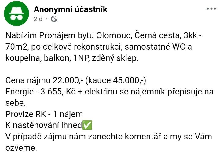 Další inzerát mě taky dojal skoro až k slzám. V jedné z kdysi nejhorších lokalit v Olomouci nabízejí 3kk, 70 metrů čtverečních, za 22 tisíc korun. Požadují kauci 45 tisíc, dále chtějí 3655 korun za energie a to si ještě na sebe máte napsat elektřinu. Plus provize RK ve výši jednoho nájmu. Takže, abyste vyfasovali klíče od panelákového bytu, jimiž čtvrť Černá cesta bývala neblaze proslulá, musíte vysolit přes 100 tisíc, a to ještě třeba v novém pseudodomově nebudete mít ani štokrle. Pokud byste si pak kvartýr sami chtěli vybavit alespoň tím základním a nejnutnějším, praskne na to minimálně dalších 50-80 tisíc. To už jsme minimálně na stopadesáti, za což byste ještě relativně nedávno pořídili obstojný (a vybavený) mobilní domek.