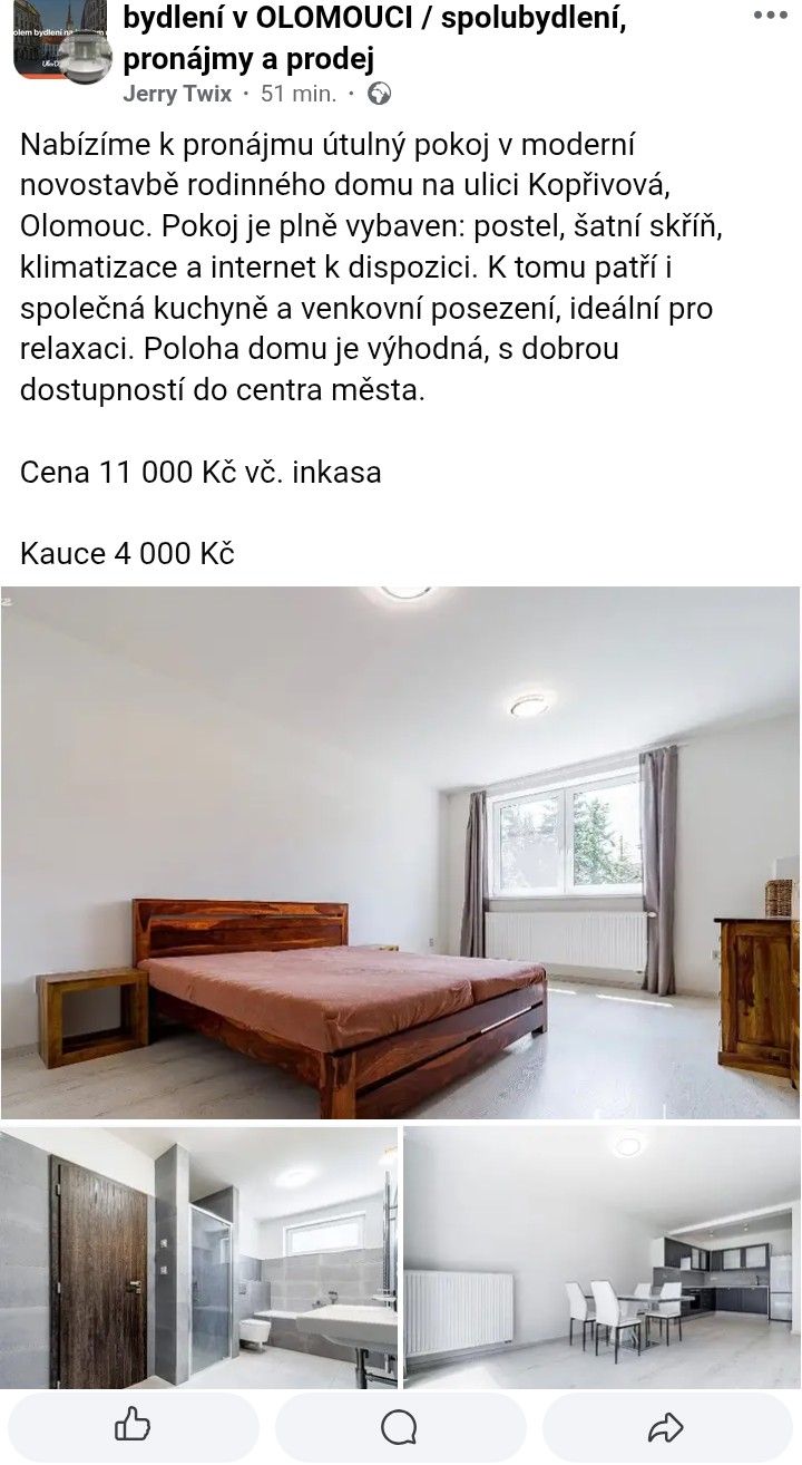 Málem mi vypadly oční bulvy, když jsem na netu zmerčil ty ceny. Jeden jediný pokoj v Olomouci za 11.300! Plus po vás ještě chtějí 4 tisícovou kauci. To je snad zlý sen. A to i přesto, že pokoj je plně vybavený, s internetem a klimatizací.