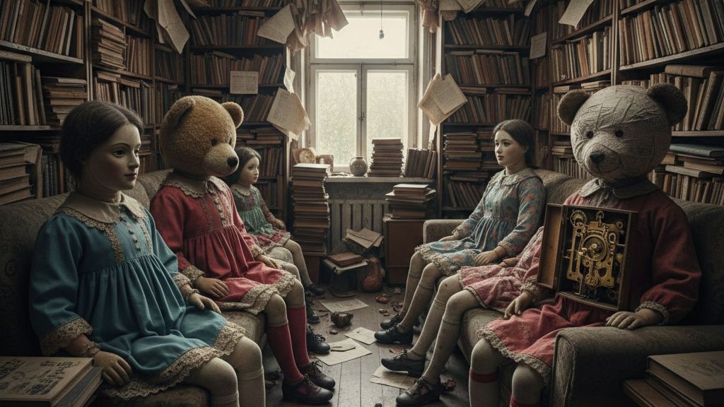 Na pohovkách, křeslech a dokonce i na policích mezi odbornou literaturou o keltské historii seděly postavy. Na první pohled působily jako nepovedené, nadměrné starožitné hračky. Byly oblečené do křiklavých barev, měly na sobě dětské punčocháče, šatičky s volánky a zimní boty. Jejich tváře však vylovávaly značné znepokojení, které se vyjasnilo ve chvíli, kdy jeden z vyšetřovatelů chtěl jednu z postav posunout, aby získal přístup k dokumentům za ní. Očekával lehkost polystyrenu nebo tuhost plastu, ale pod prsty ucítil nepoddajnou, těžkou a mírně pružnou hmotu. Když poodhrnul rukáv jedné z postav, zděsil se. Pod dětským oblečením nebylo dřevo ani plast, ale mumifikovaná lidská tkáň obalená v gáze.