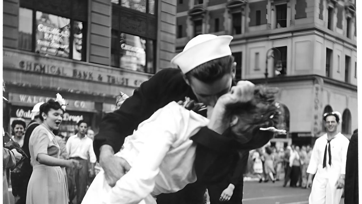 Alfred Eisenstaedt se v tom ohromném davu na Times Square pohyboval s taktem a nevtíravostí, která byla pro jeho tvorbu typická. Neustále se snažil být o krok před spontánností a zachytit ryzí lidskou reakci. A tehdy, v tom hřmotu vítězství, uviděl námořníka, který byl ztělesněním nefalšované radosti. Jak Eisenstaedt sám popsal, tento námořník ve tmavé uniformě běžel ulicí a líbal každou ženu, kterou potkal. Jestli to byla babička, statná, hubená nebo stará, na tom nezáleželo. Byl to nezkrotný projev uvolnění, v němž se mísila úleva z konce války a, jak se později ukázalo, i účinek několika vypitých sklenic.