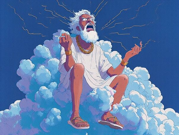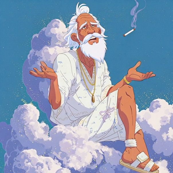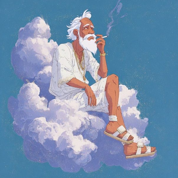 No vzápětí se na nebi zjevil Bůh. Prej proč jsem takovej ničema, zlobil se. Měl bílej vous, bílej vlas, bílej plášť, bílý sandály a bílý cigáro. Definitivně, tohle musel bejt Bůh.