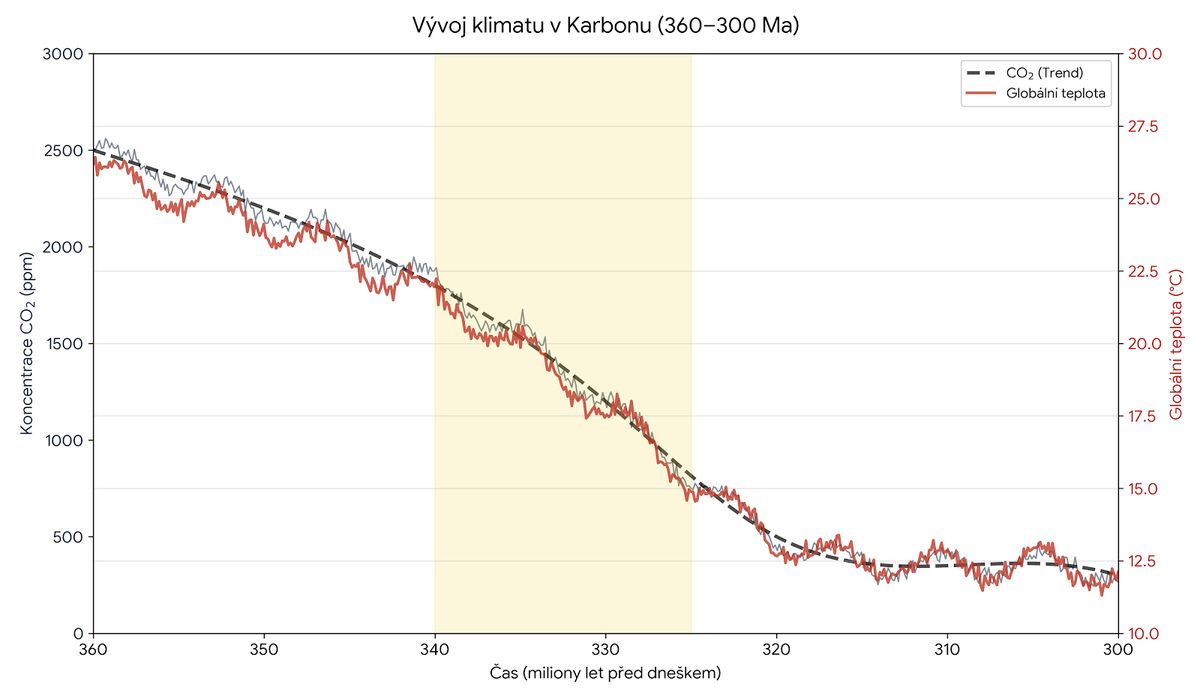 1. Graf zobrazuje pokles koncentrací CO₂ a globální teploty během karbonu (před 359–299 miliony let). Černá křivka ukazuje pokles atmosférického CO₂ z přibližně 2000 ppm na hodnoty kolem 300 ppm. Červená křivka ukazuje trend ochlazení globální teploty v rozsahu ~8 °C. Data jsou založena na paleoklimatických metodách a modelování: