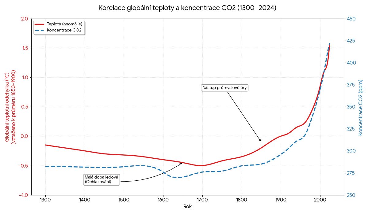 2. Graf ukazuje reálný historický vývoj koncentrací CO₂ a globální teploty mezi roky 1300 a 2023.