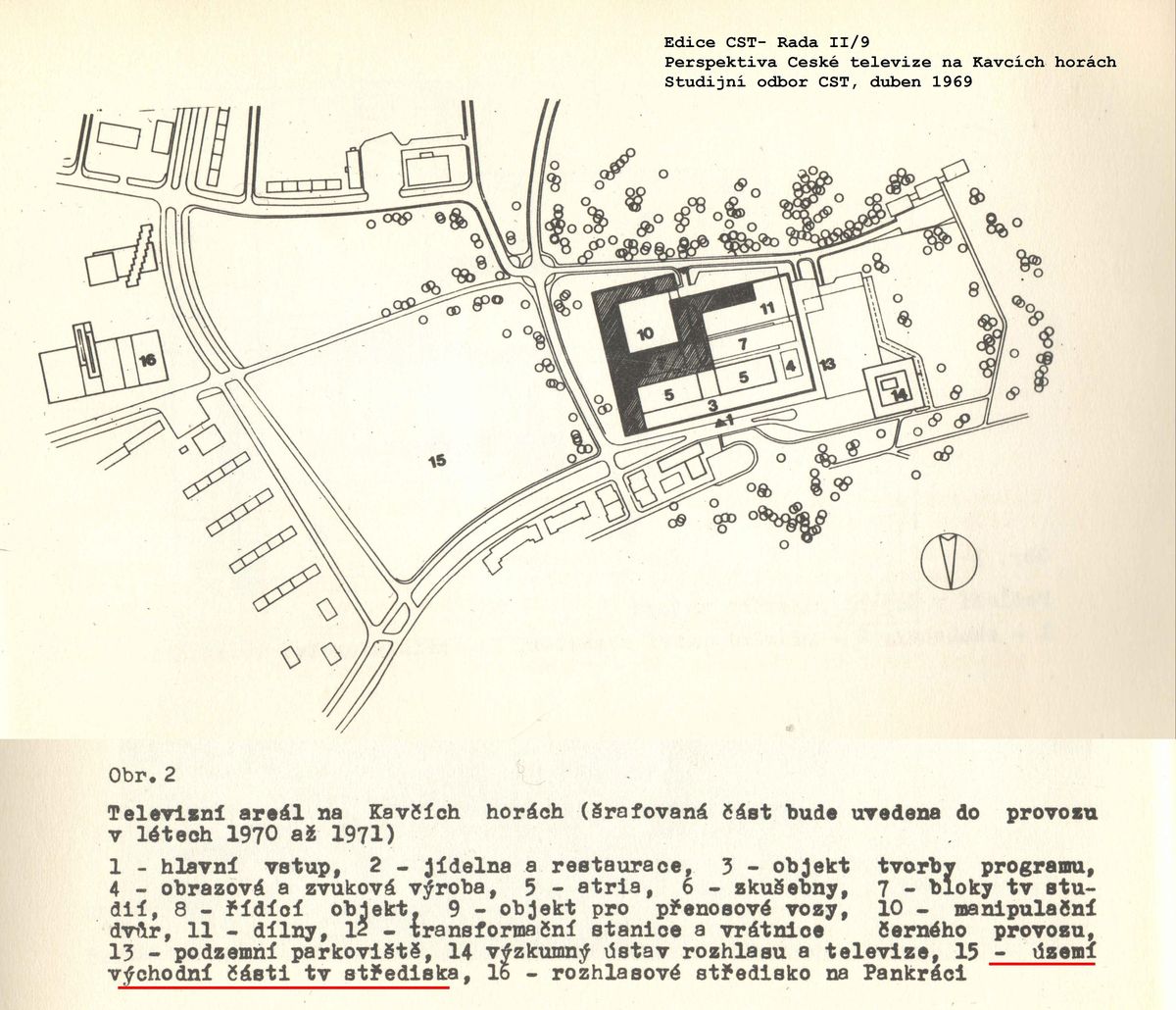 Protože peníze na Kavčí hory-Východ stále nebyly – mluvilo se o horizontu zahájení stavby někdy v 80.letech – zvolilo se náhradní řešení. Na uvedené mapce se vpravo dole pod číslem 14 krčí plánovaný objekt Výzkumného ústavu rozhlasu a televize. V roce 1976 padlo rozhodnutí, že tahle budova se stane sídlem televizního zpravodajství; projekt dostal zkratku OTN - objekt Televizních novin (dnes se mu říká OZ – objekt zpravodajství). Budova, která původně měla sloužit výzkumníkům, se složitě předělávala, a po četných vnitřních přestavbách se odtud do dnešního dne vysílají zpravodajské pořady ČT.