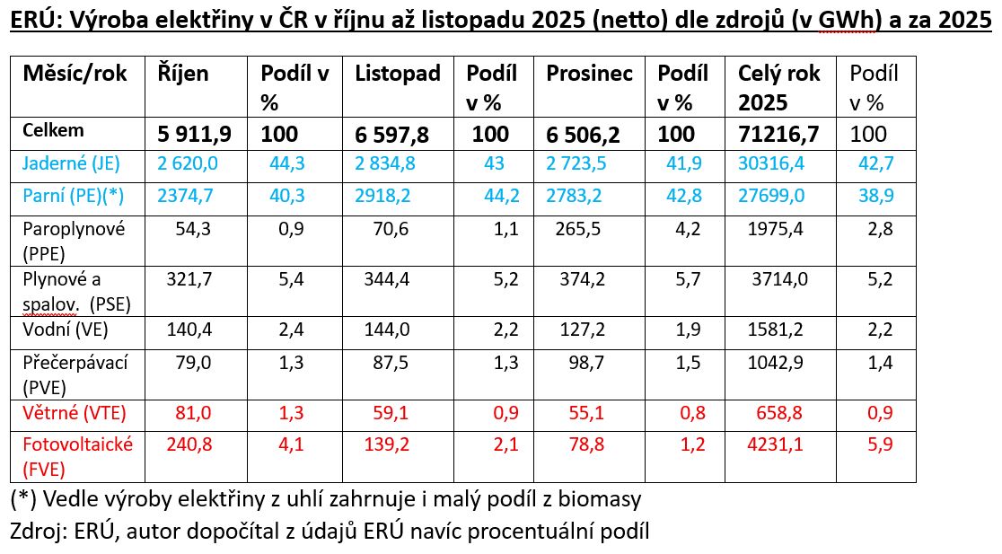 Tvrdá fakta Energetického regulačního úřadu (ERÚ) o výrobě elektřiny v Česku dle zdrojů v posledním čtvrtletí loňského roku a i v číslech za celý rok 2025 ukazují, že v nejnáročnějším zimním období se dosud může elektrizační soustava opírat z 84 až 87 % o stabilní dodávky z jaderných elektráren Dukovany a Temelín a z uhelných zdrojů.