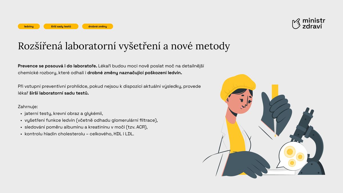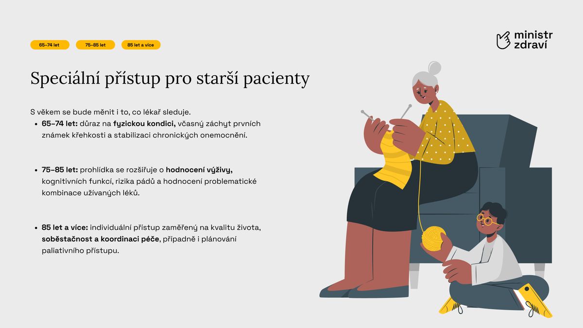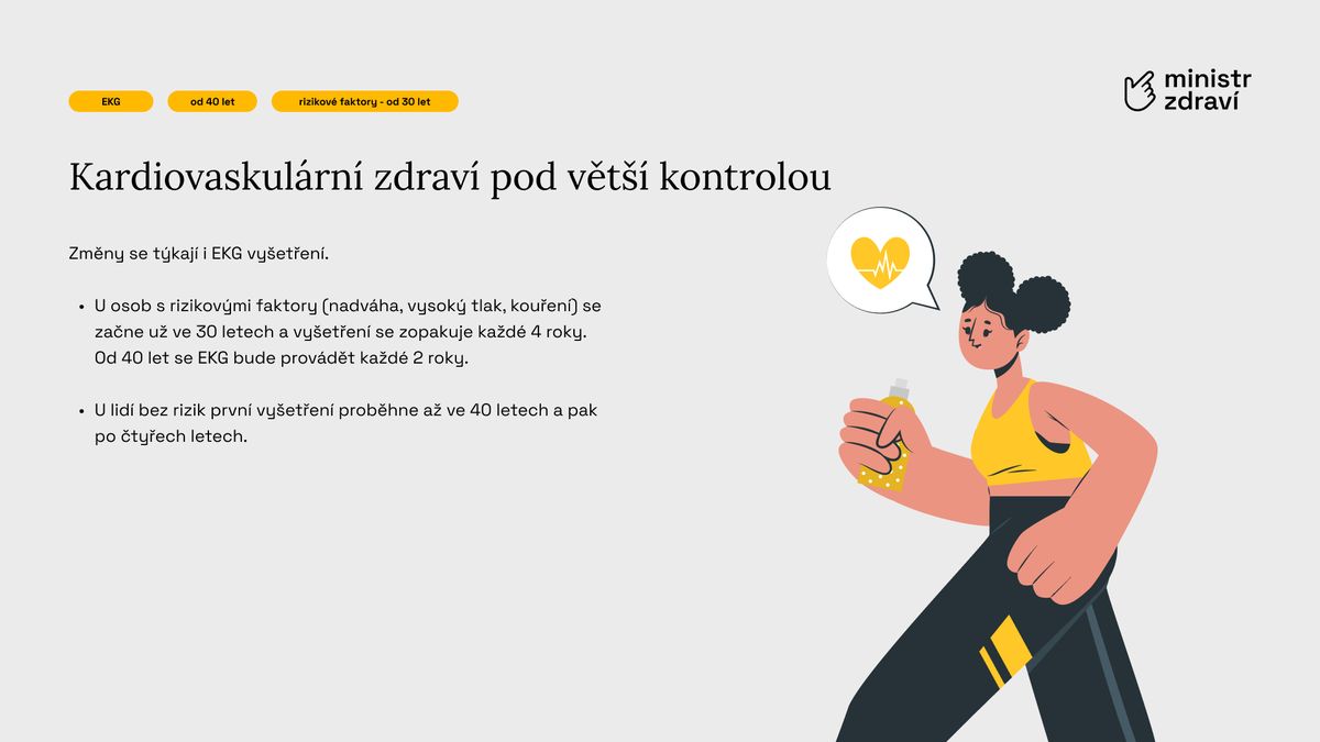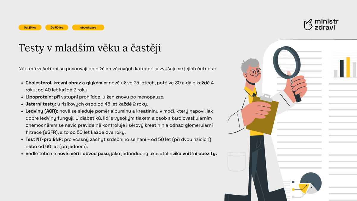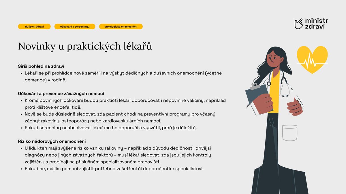 Zásadní novinkou je však rozšířený obsah prohlídek. Lékaři budou nově posuzovat zdraví pacienta komplexněji – od srdce a cév přes ledviny, játra až po duševní zdraví a životní styl. Každý pacient by měl na závěr získat stručný individuální plán péče na další období.