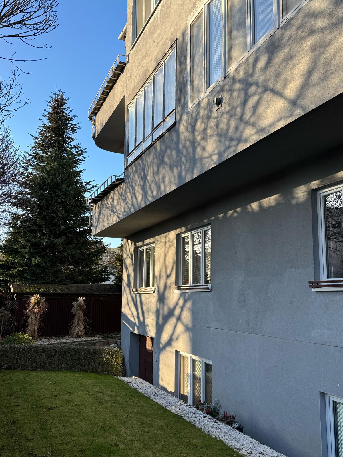 Na 134 metrech čtverečních svítí slunce z každé strany. Velké místnosti, dva balkony, zimní zahrada. Výhled do zeleně a klid, jaký se v blízkosti centra Brna jen tak nevidí. K tomu zahrada se vzrostlými stromy, kde si lze vychutnat ranní kávu.