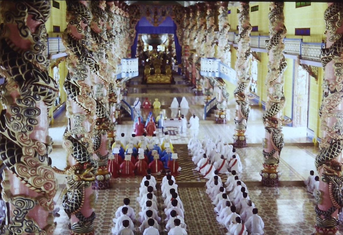 Pak vzduch rozechvějí jemné zvuky fléten a tradičních strunných nástrojů. Pěvecký sbor ukrytý nahoře na galerii začíná zpívat podivnou éterickou píseň, složenou jenom z několika málo neustále se opakujících slov. Náhle drtivý úder gongu zasáhne prostor. A po něm další. Hlavní branou i bočními vchody vstupují do sálu řady věřících. Míří k hlavnímu oltáři, ověnčenému obrovským glóbem s namalovaným vševidoucím okem uprostřed. Zde pokorně usedají na podlahu posetou ornamenty. S bradami přitisknutými na prsa připojují své hlasy k chorálu. Obrovští hadi obtočení kolem růžových nosných sloupů chrámové lodi hrozivě cení plamenné tlamy. Nebeská vznešenost v pitoreskním prostředí lunaparku. Jedna ze čtyř každodenních mší v chrámu Tay Ninh - sídle vietnamské náboženské sekty Cao Dai - právě začíná.