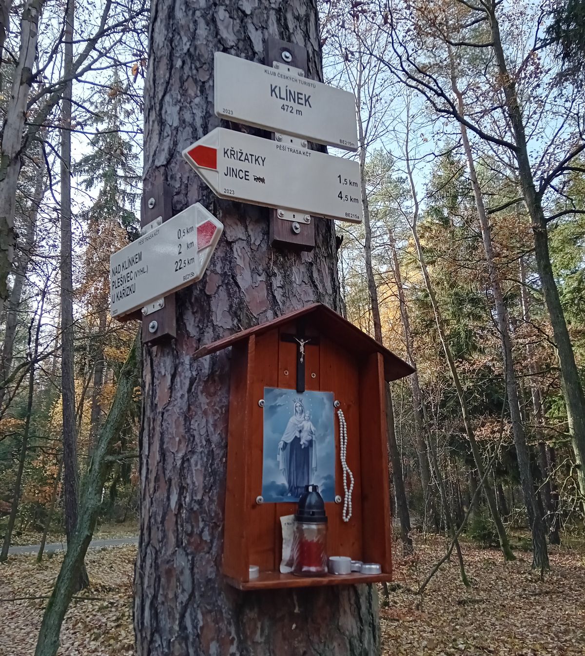 Nejprve je třeba pochopitelně k vyhlídkám vystoupat. Startovních míst pro zdolání Plešivce (součásti Brdských Hřebenů) se nabízí víc, pravděpodobně nejpohodlnější variantou je vydat se z rozcestí Klínek. Nachází se necelé dva kilometry severovýchodně od Jinců. Zájemců se tu okamžitě ujímá červeně značená turistická stezka. Ujala se i mě.