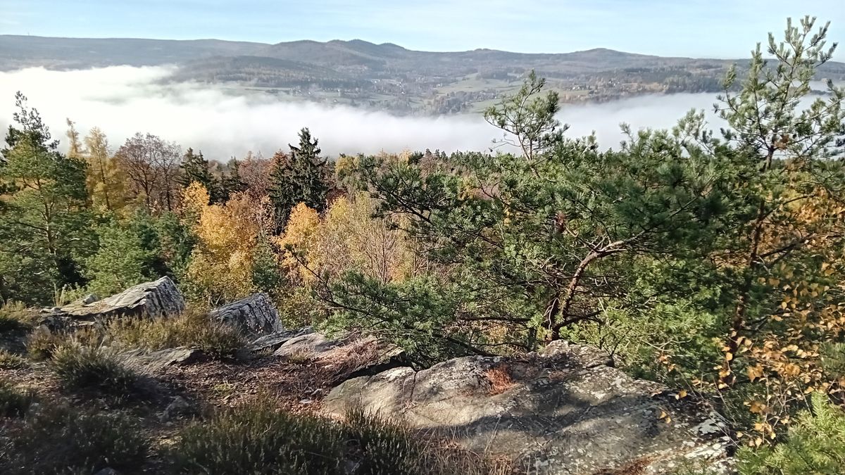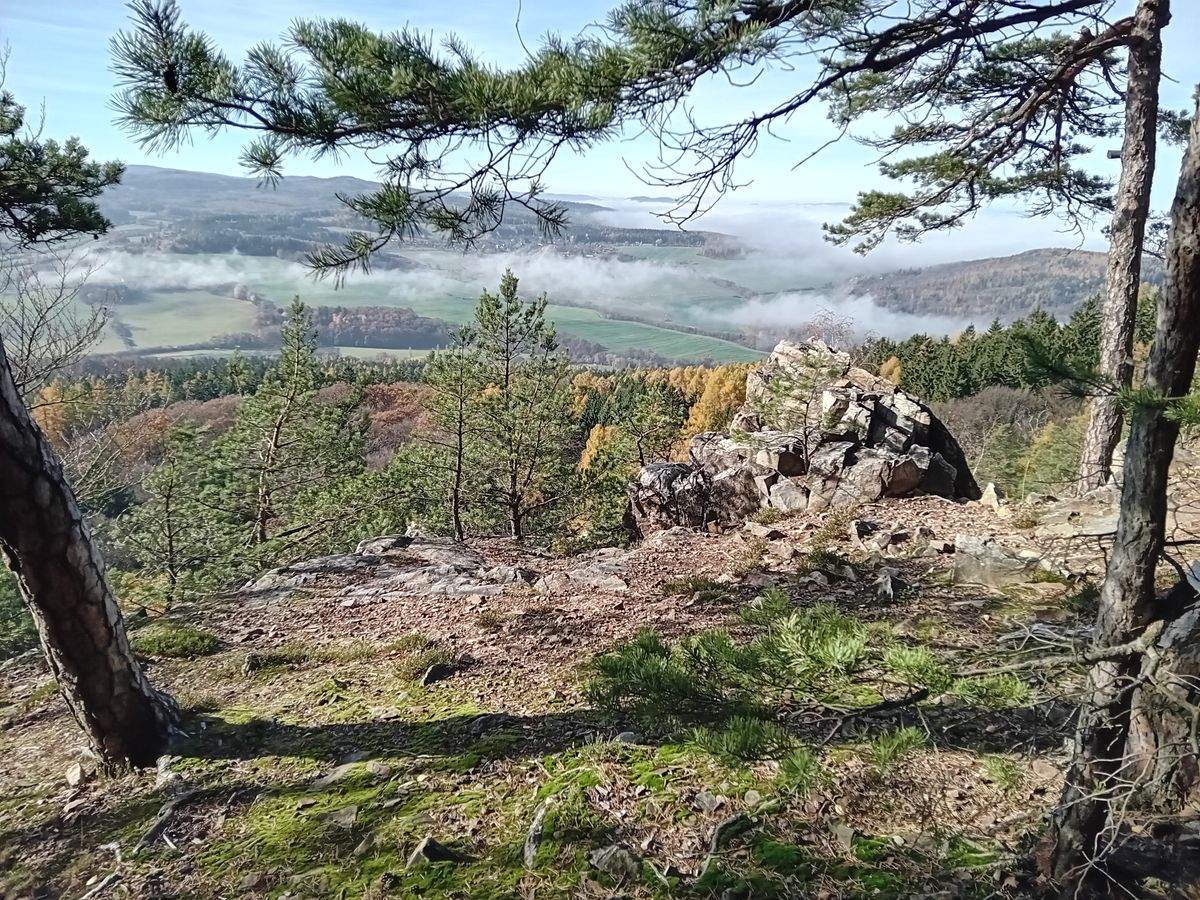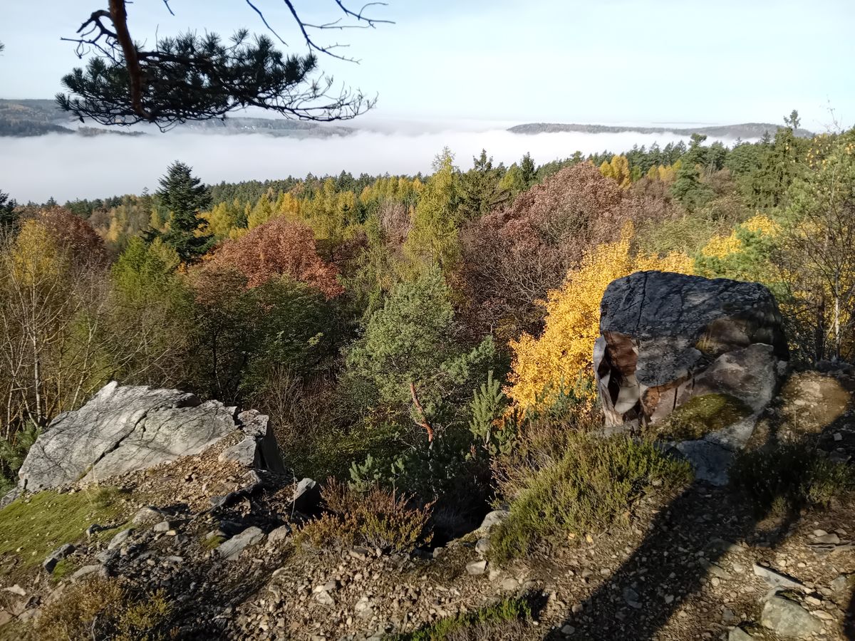 Takže pohledy od rozeklaných skal do zvlněné krajiny – a místy zdánlivě jen jakoby do mraků, z nichž se tu a tam vynořovaly oblé vrcholky okolních kopců – se naskýtaly více než působivé. Ale nepředbíhejme.