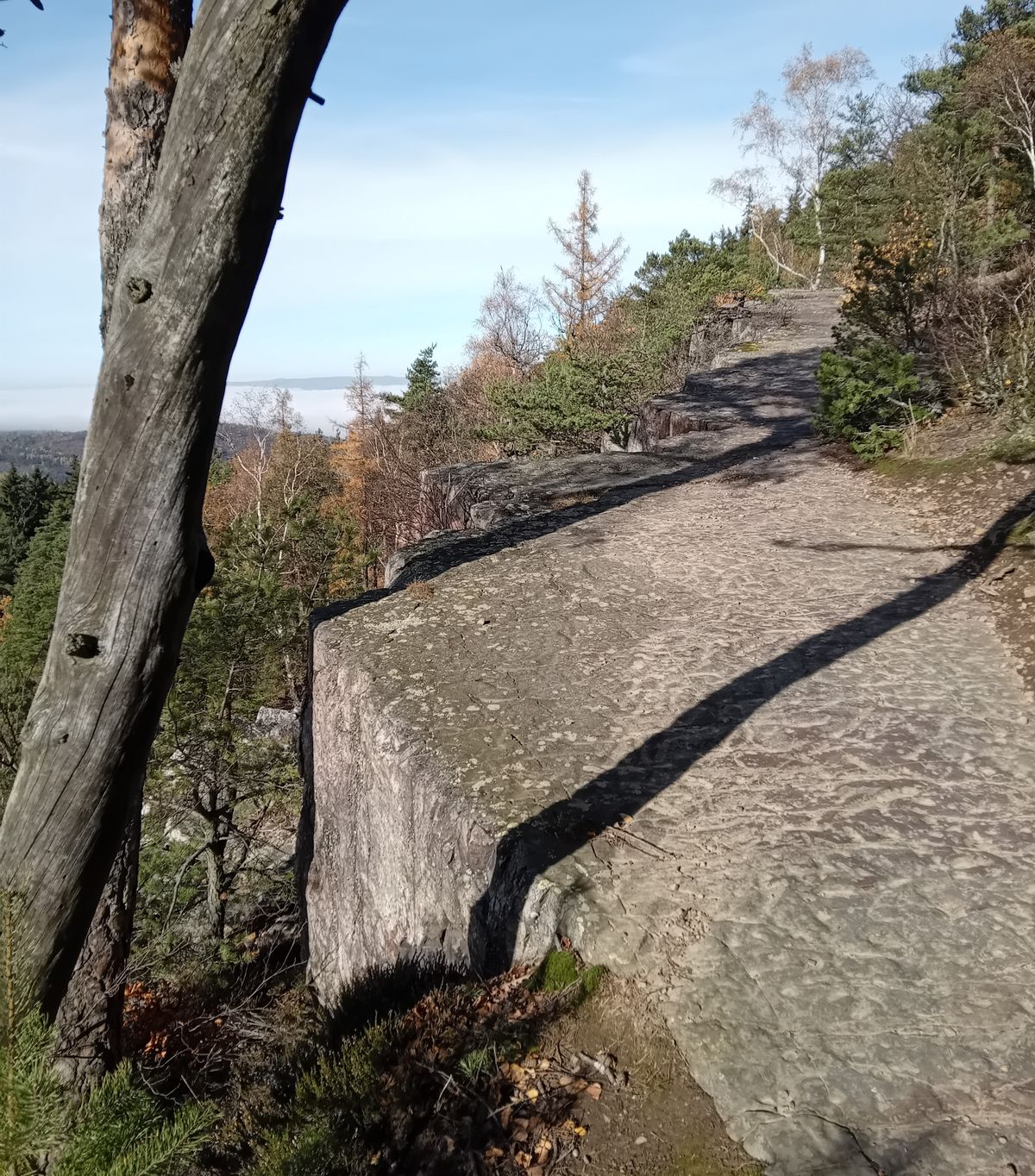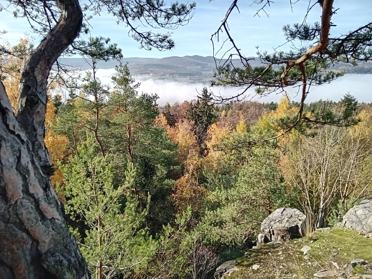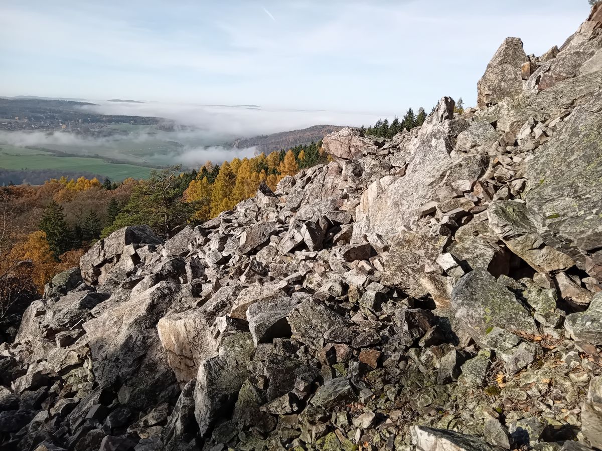 Takže pohledy od rozeklaných skal do zvlněné krajiny – a místy zdánlivě jen jakoby do mraků, z nichž se tu a tam vynořovaly oblé vrcholky okolních kopců – se naskýtaly více než působivé. Ale nepředbíhejme.