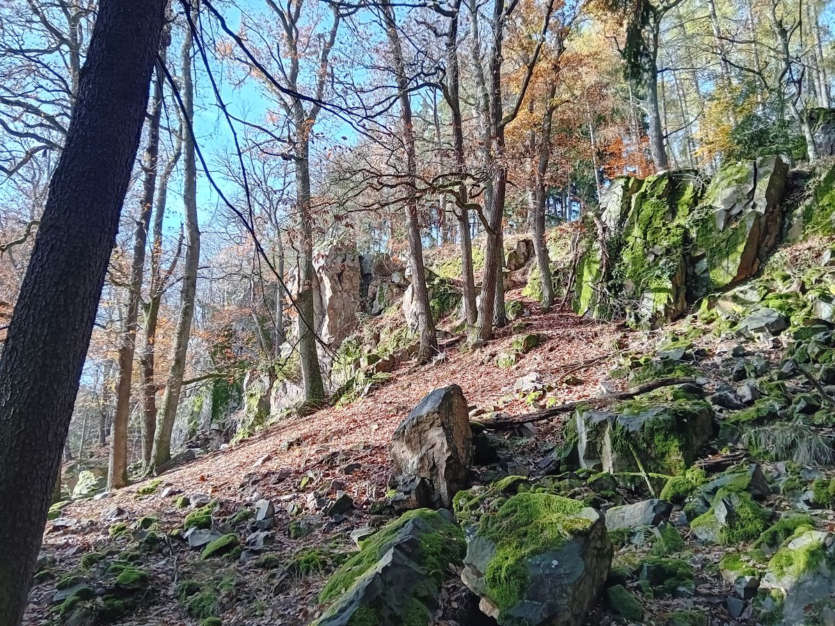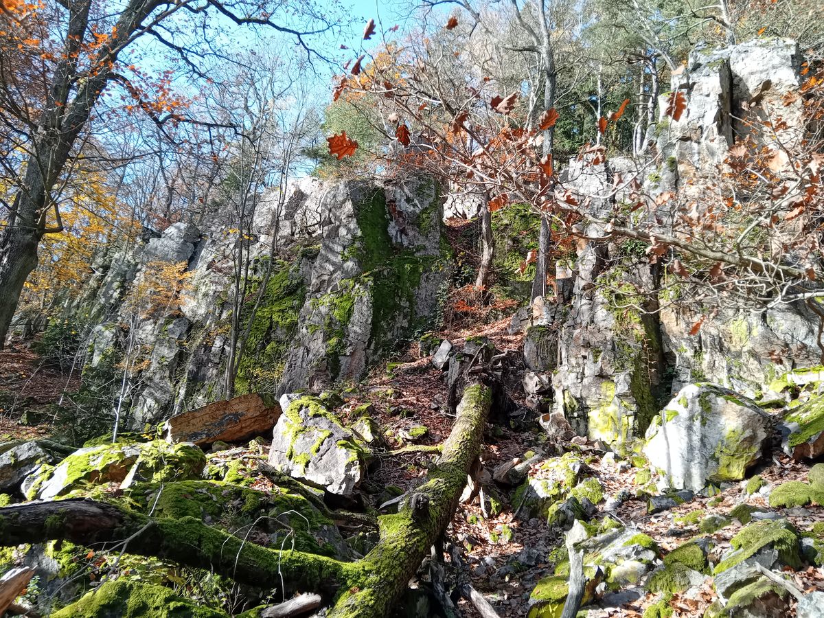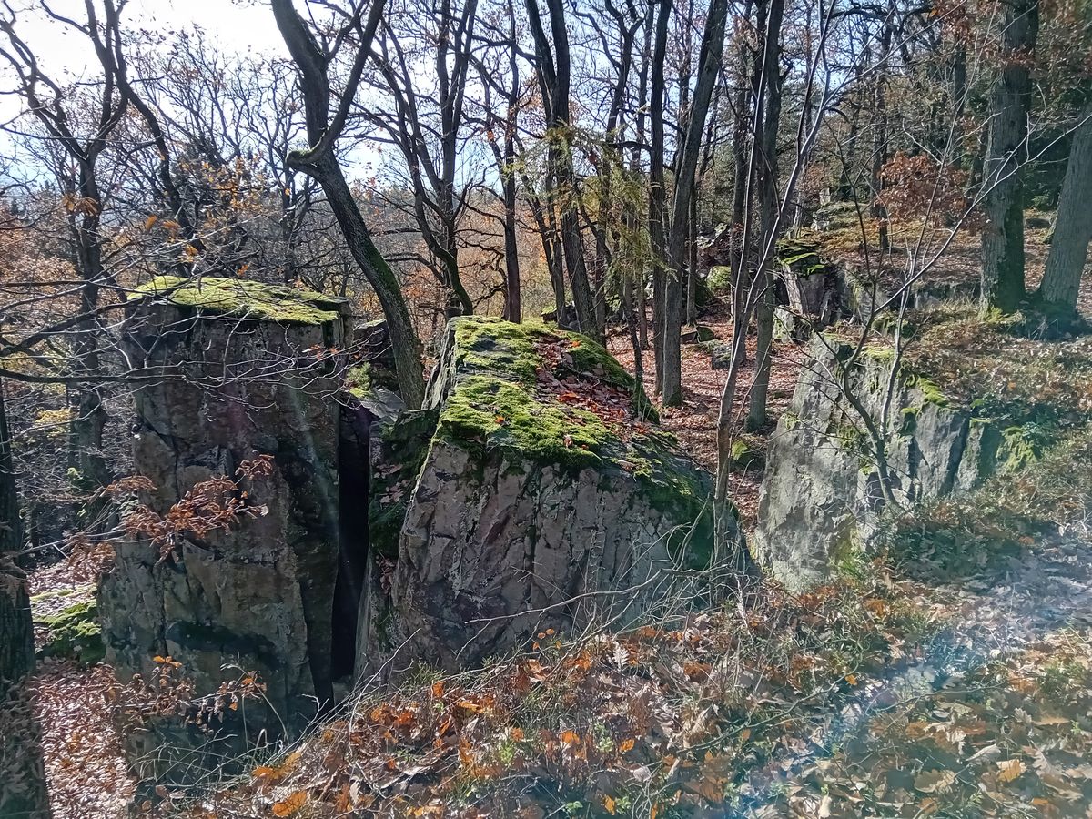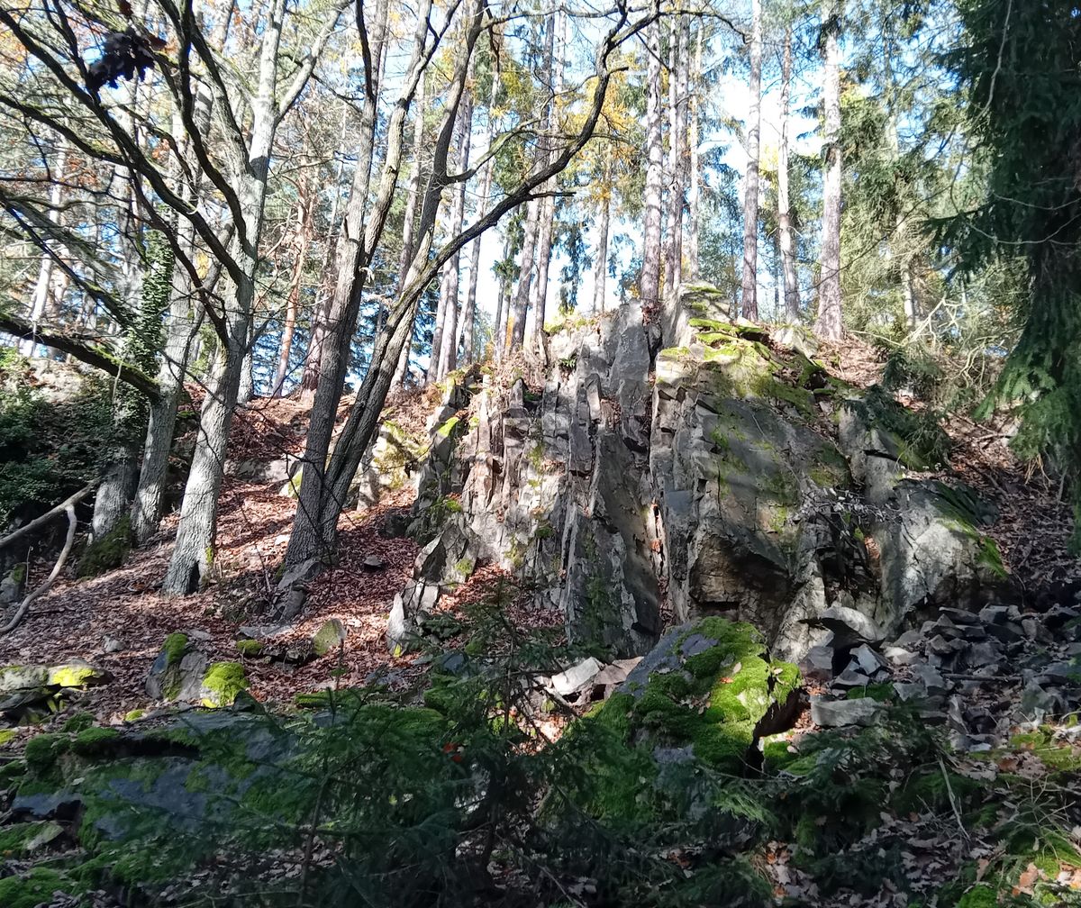 Z nadmořské výšky 472 metrů jsem se po necelém kilometru dostal o 46 metrů výš a stanul u zmíněné skály. Jedné z mnoha, jež spoluvytvářejí tento mohutný křemencový masiv nad údolím řeky Litavky, který svou nejvyšší kótou dosahuje nadmořské výšky 654 metrů.