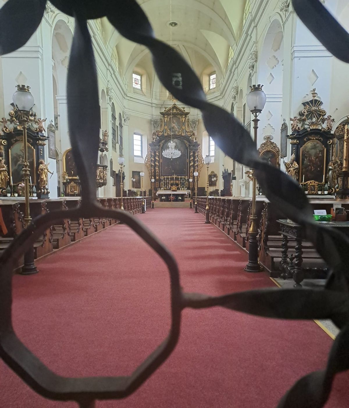 „Hlavní oltář zasvěcený Všem svatým z 18. století je rokokový,“ lze se dočíst např. na Mapách.com. Oltář a část interiéru jsme měli v tomto případě možnost zahlédnout – přes zamřížované a prosklené vchodové dveře.