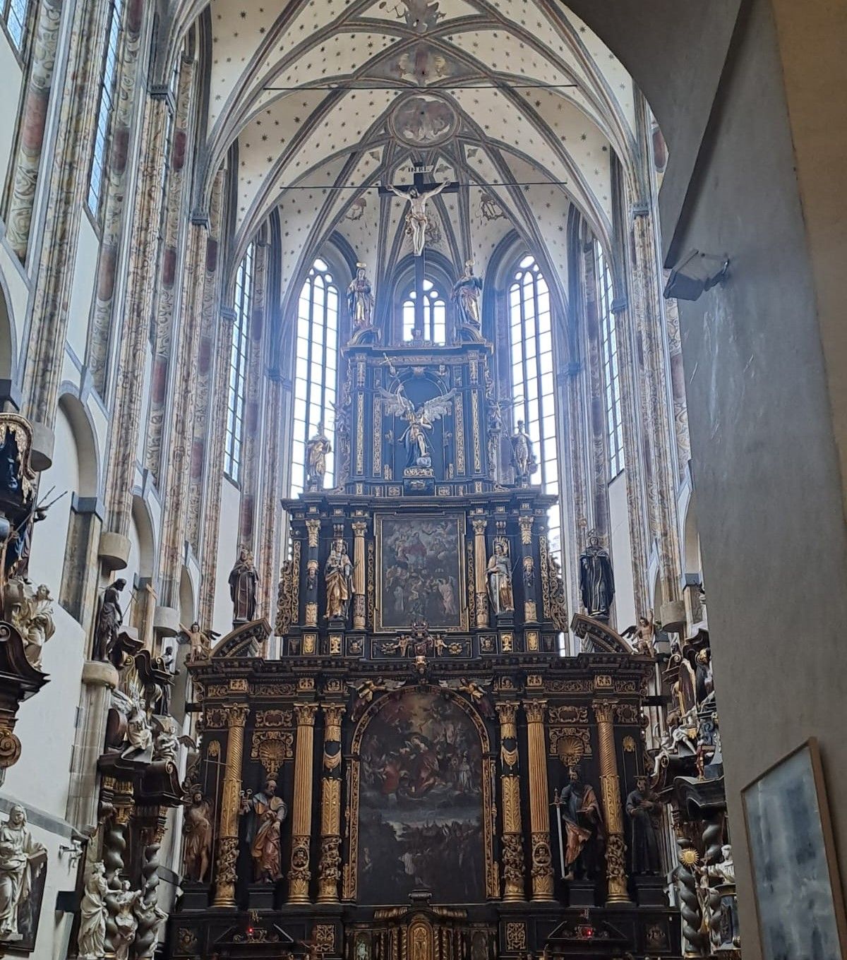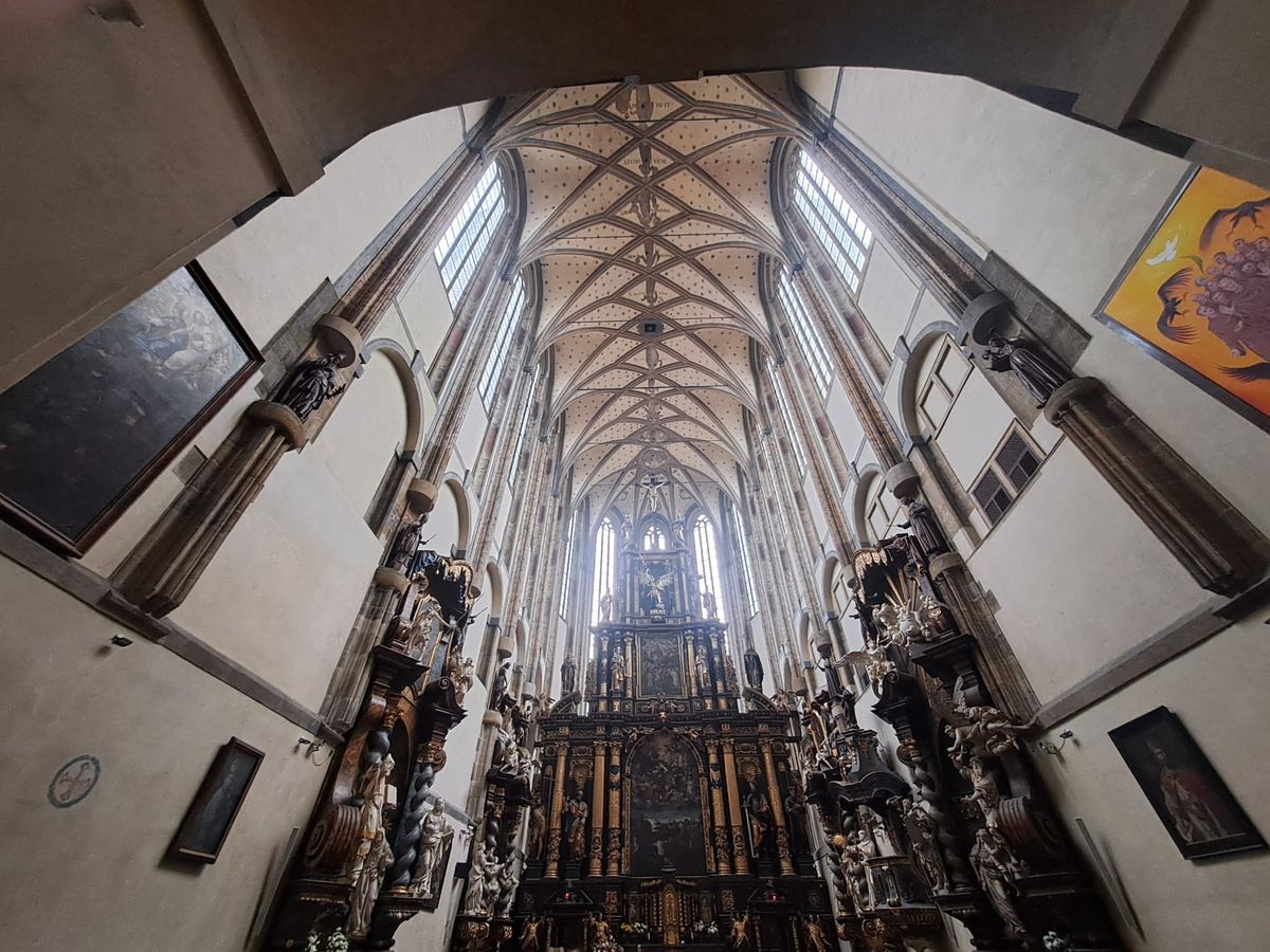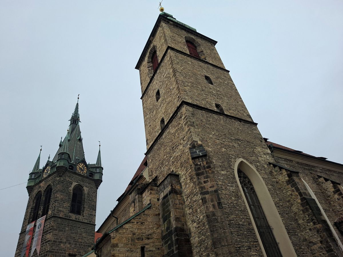 Pod ní – hned přes ulici – tak trochu méně nápadně až téměř skromně stojí kostel sv. Jindřicha a sv. Kunhuty. Ale nenechme se mýlit. Historicky se jedná o jednoznačně dominující stavbu. Protože ta to byla, kdo podmínil vznik věže.