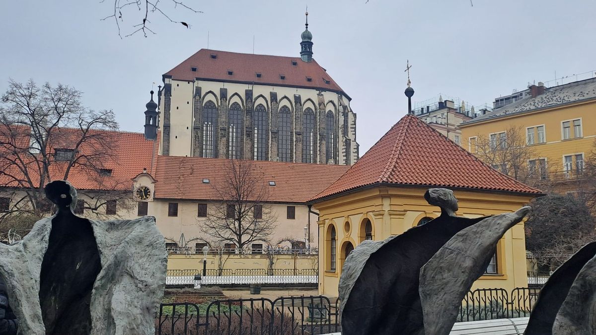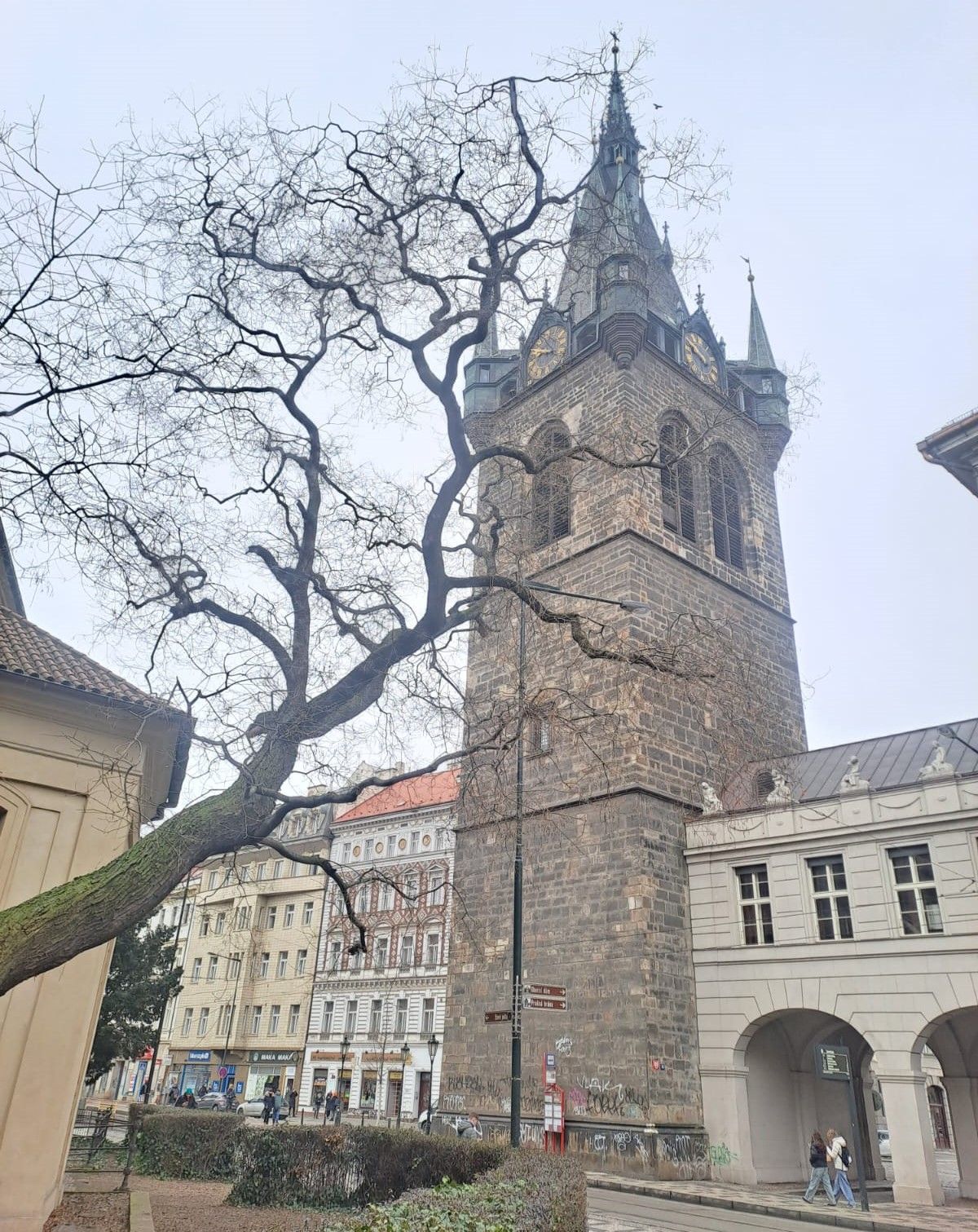 Kolem Velké synagogy (momentálně až do 15. března uzavřené, jak hlásá informační cedule) se právě blížíme k úvodnímu cíli této pražské výpravy. Jím je už z dálky viditelná Jindřišská věž.