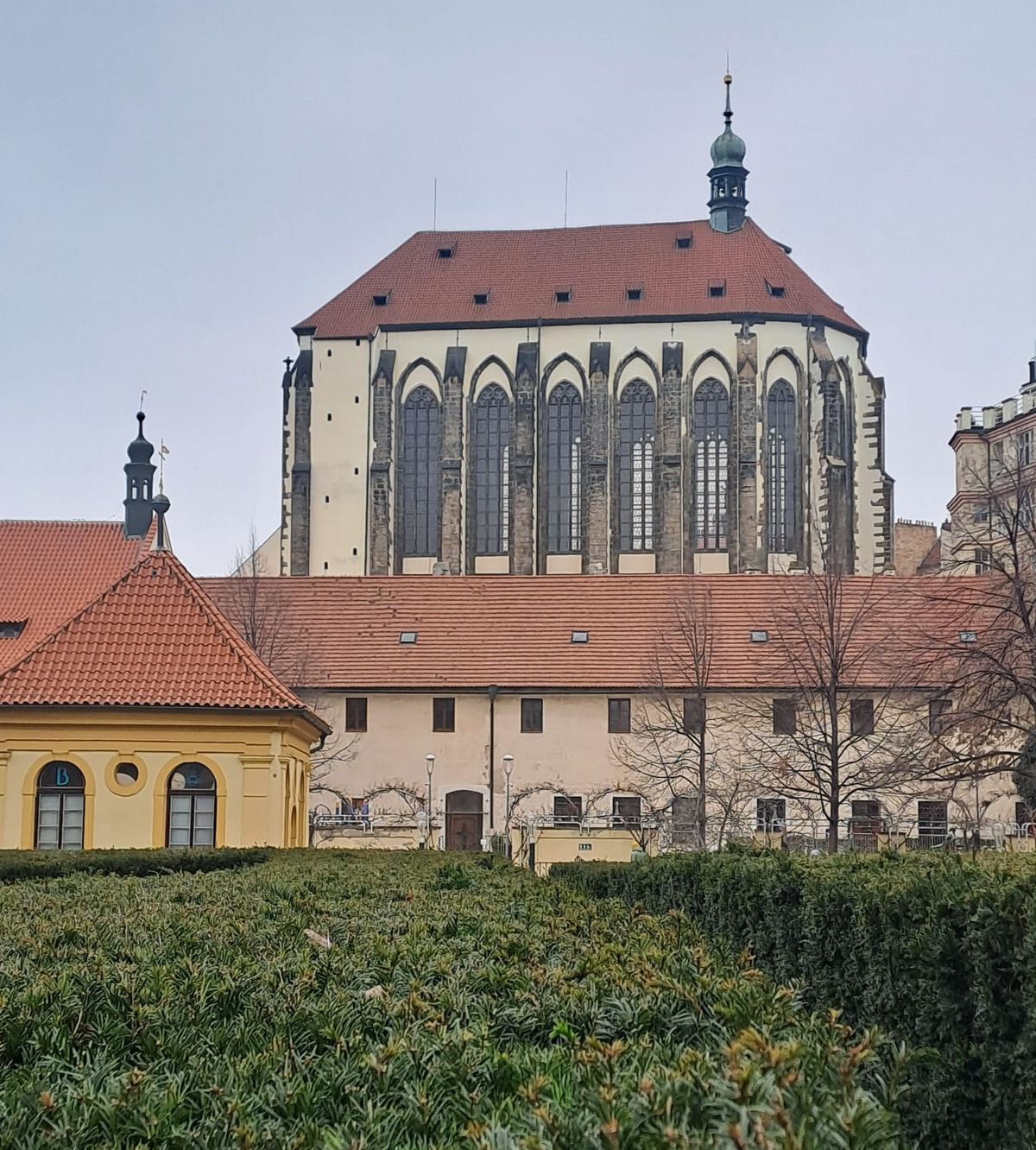 Nad zahradou, její vegetací, několika sochařskými díly i nad kaplí se doslova vznáší sousední stavba – chrám Panny Marie Sněžné. Objekt působí opravdu monumentálně – zvenčí i uvnitř.
