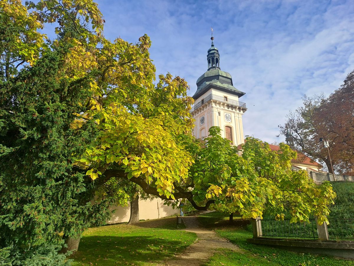 Naše kroky vedou dalších zhruba dvě stě metrů západním směrem, k zámeckému areálu. Jeho přítomnost už z dálky avizuje kostel Narození Panny Marie, respektive jeho barokní věž s ochozem postavená v 18. století. Samotný svatostánek je podstatně starší, založen byl v roce 1349 společně s klášterem. Galerií je kostel propojen se zámkem.