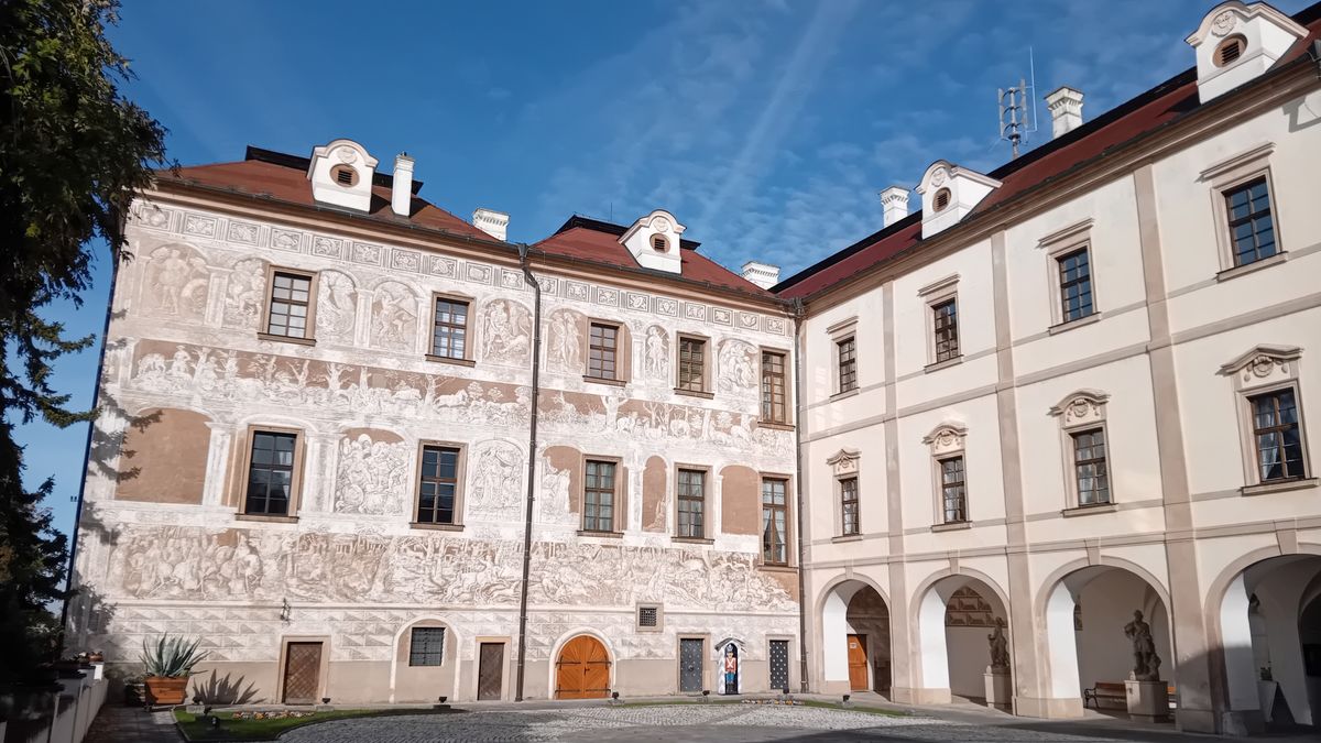 Dříve než se ocitneme v zámeckých interiérech, procházíme se okolním parkem doslova zářícím podzimními stromy a jejich zlatým a rubínovým listím, okusíme několik opravdu dalekých vyhlídek z hrany ostrohu a potěšíme se pohledem na renesanční sgrafita na nádvoří.