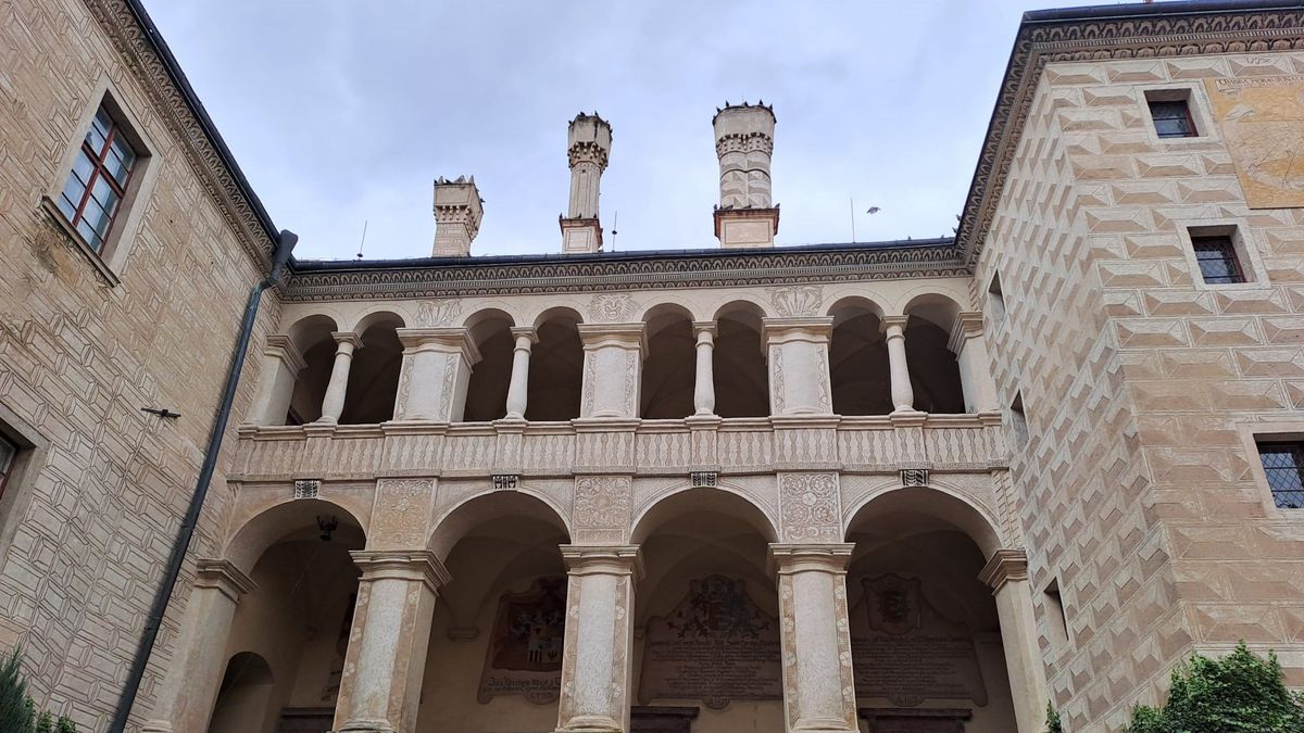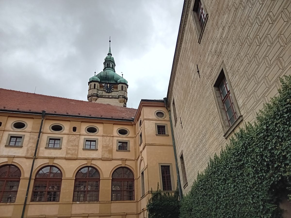 Vstupujeme na zámecké nádvoří – a krátce poté i na prohlídkovou trasu. V čase naší pozdně říjnové návštěvy byl zámek kromě pondělků přístupný denně, od 4. listopadu do konce roku bude vítat zájemce o prohlídku od pátků do nedělí.