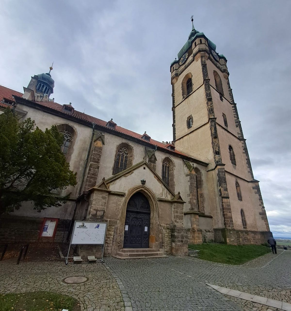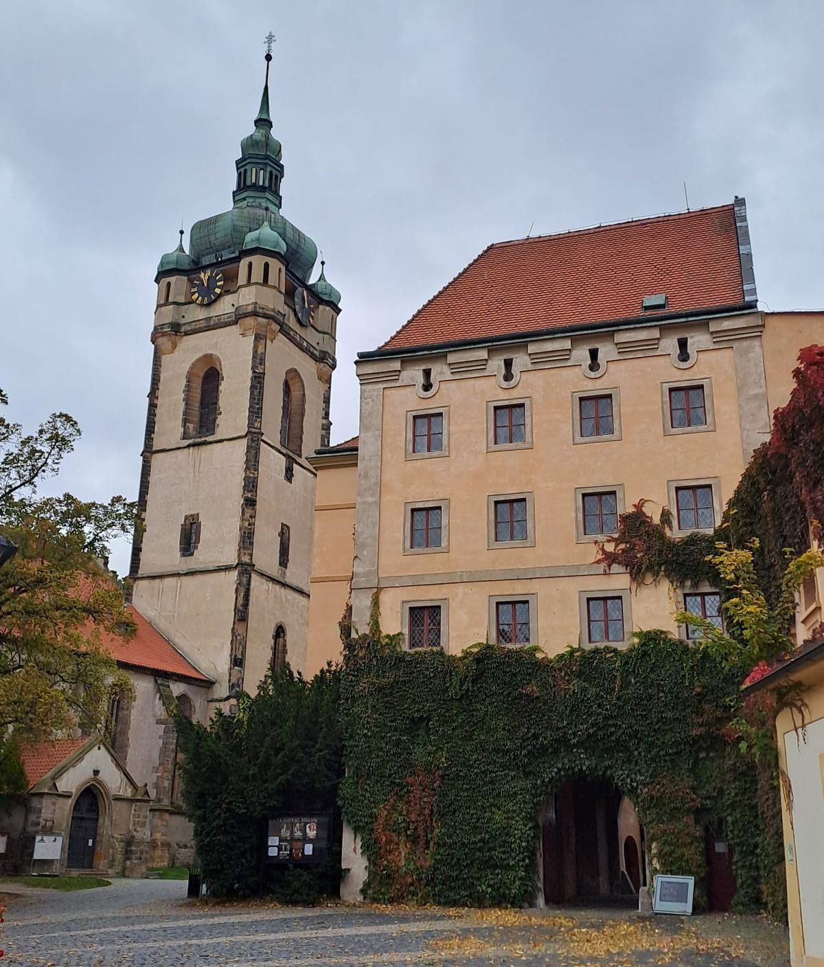 To jsme mezitím již došli pod štíhlou a hrdě se vypínající věž, kterou jsem v dětství mylně považoval za součást v těsné blízkosti stojícího zámku. Jistě, věž patří kostelu.