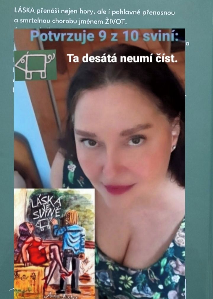 A k té Svini (pozn.: zkratka knihy Láska je svině). My tu lásku také opěvujeme. Jen jinak. Máme prostě rádi svině. Já teda mnohem víc než lidi.