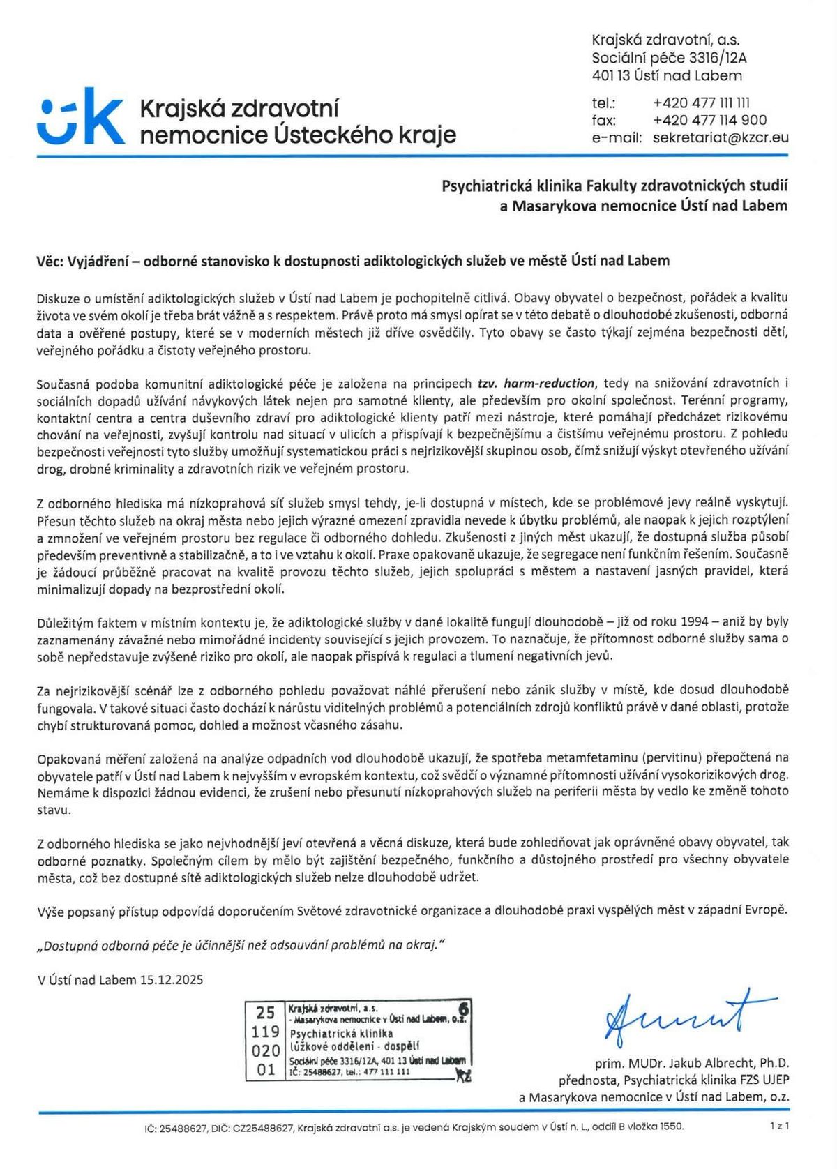 „Ústí nad Labem se ocitlo v učebnicovém střetu mezi vědou a populismem. Zatímco odborná obec předkládá jasná data, vládní strategie a metodiky harm reduction, které jednoznačně potvrzují nezbytnost existence K-centra v centru města, místní politici volí cestu nejmenšího odporu. Ignorováním odborných dokumentů ve prospěch emocí a předvolebního marketingu však zastupitelé rozehrávají nebezpečnou hru s veřejnou bezpečností. Následující text analyzuje, proč je vytěsňování adiktologických služeb na periferii jen drahou iluzí pořádku, která ve skutečnosti vrací problém s drogami přímo pod okna běžných občanů, a to v mnohem nekontrolovanější podobě.“