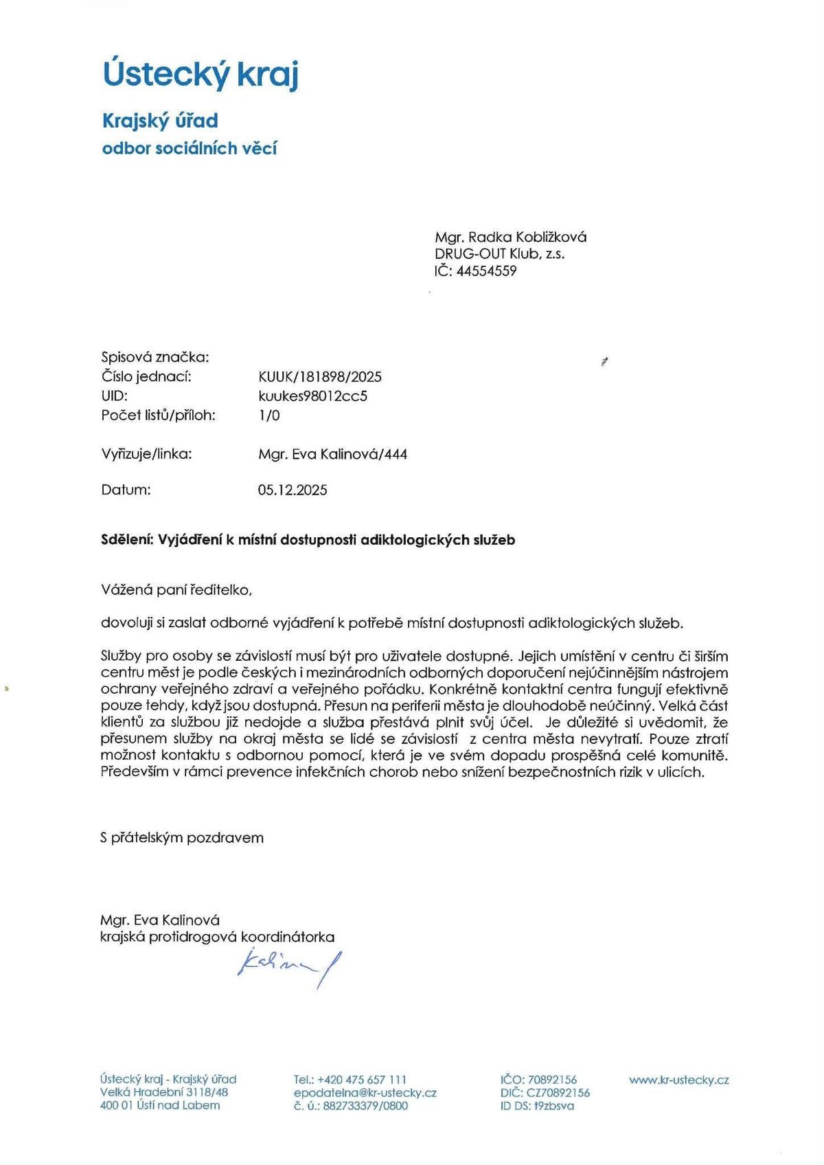 „Na současné adrese můžeme provozovat adislužby do 31.3.2026, byl podepsán dodatek k nájemní smlouvě. Předpokládáme, že do té doby bude znám výsledek odvolání proti rozhodnutí stavebního úřadu v Ústí nad Labem. To, co zmiňujete městu hrozí, pokud nebudou nízkoprahové adiktologické služby fungovat. V případě covidové epidemie,současné epidemie hepatitidy A a nárůstu lues ve městě jsme měli a máme důležitou roli v testování rizikových osob a prevenci šíření.“