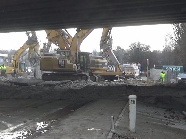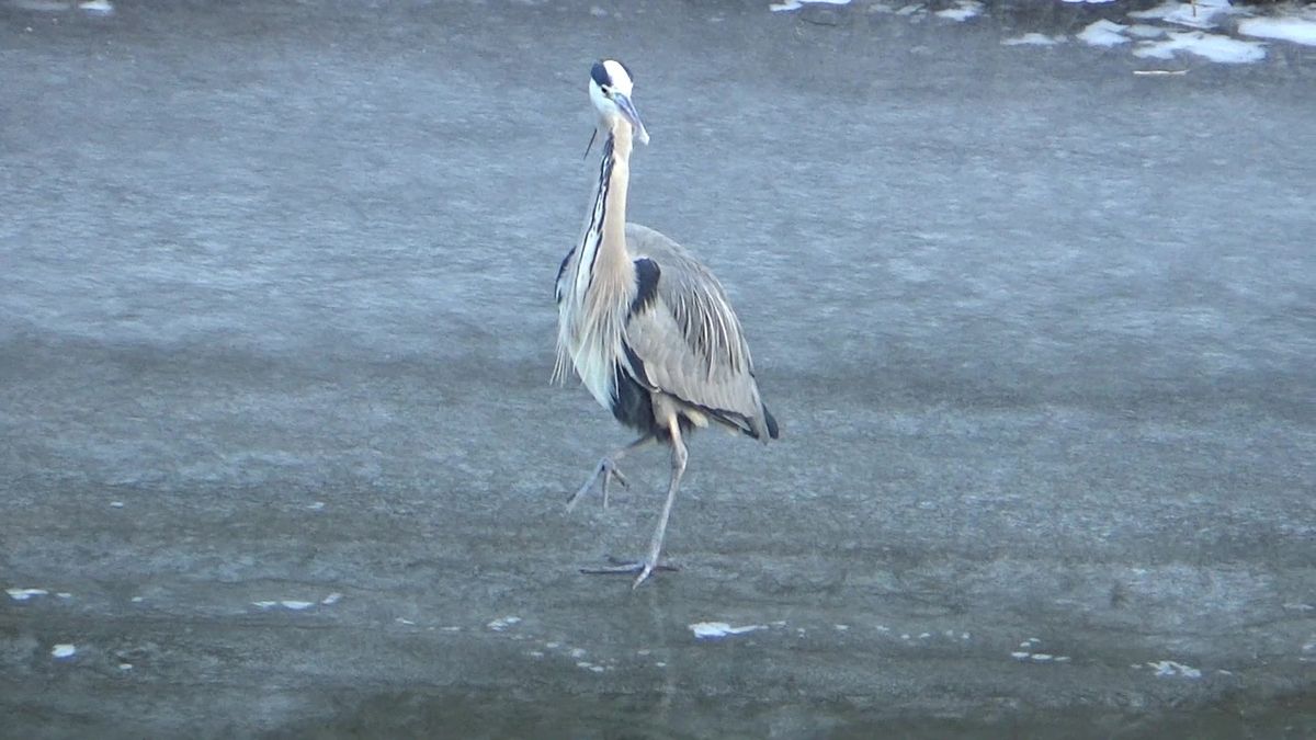 Klouzající a asi zmrzlá volavka na zamrzající řece Svitavě v Brně.
