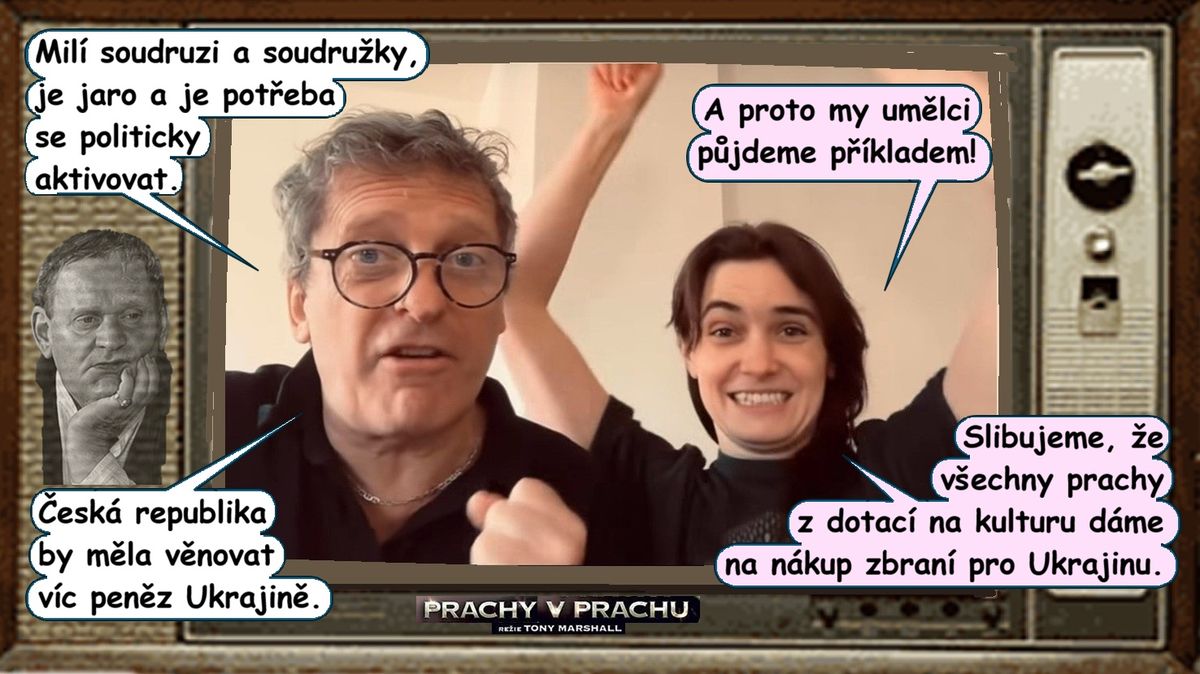 Vpřed od frází k činům. Čeští angažovaní umělci se agitkou staví do čela lidu k ochraně demokratického zřízení, prezidenta Pavla a Ukrajiny s důležitou výzvou. Nebojte se, nelžete a nekraďte. Vzbuďte se ze zimního spánku a aktivně řvěte. Hurááá.