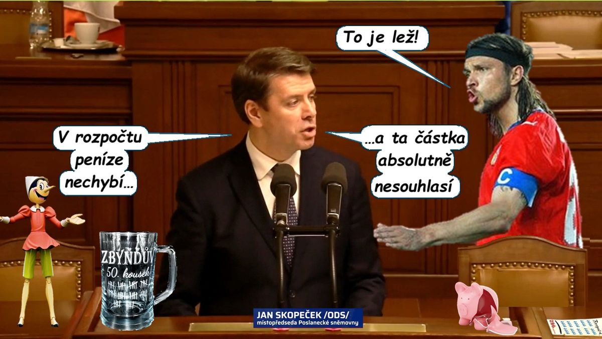 V rozporu s nálezem NRR místopředseda PS Skopeček bezostyšně zapíral chybějící miliardy v rozpočtu z končícího mejdanu bývalé pětikoalice, čímž dal vzpomenout na bujarou párty a legendární hlášku fotbalisty Ujfalušiho z flámu fotbalové reprezentace.