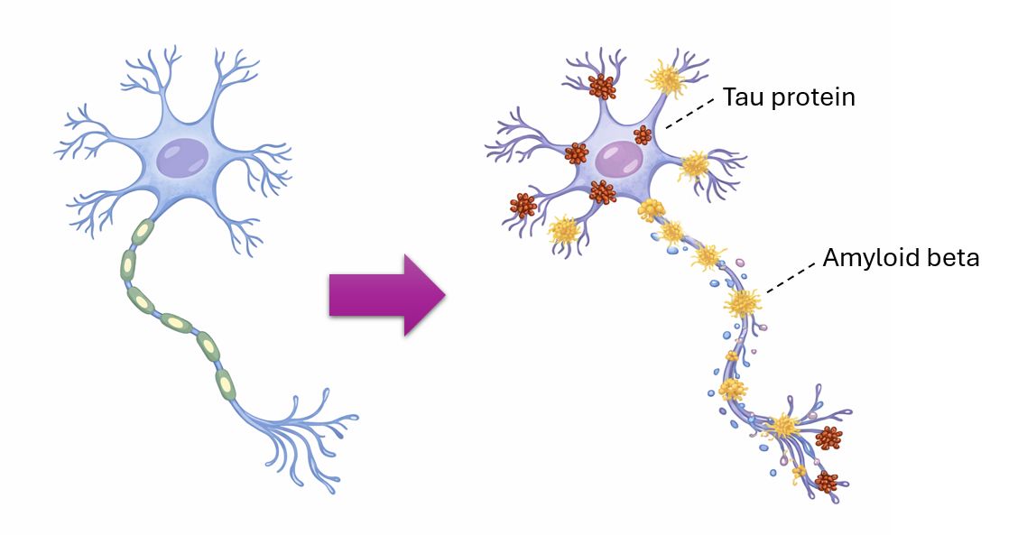 Na buněčné úrovni je Alzheimerova nemoc spojena především se dvěma typy patologicky změněných bílkovin: amyloidem beta a tau proteinem. Ty se v mozku za normálních okolností vyskytují, u Alzheimerovy nemoci se však začínají chovat jinak. Amyloid beta se hromadí v prostoru mezi neurony, kde narušuje jejich vzájemnou komunikaci, zatímco tau protein se mění přímo uvnitř nervových buněk a poškozuje jejich vnitřní strukturu. Právě postupné hromadění těchto proteinů vytváří prostředí, ve kterém neurony přestávají správně fungovat a postupně zanikají.