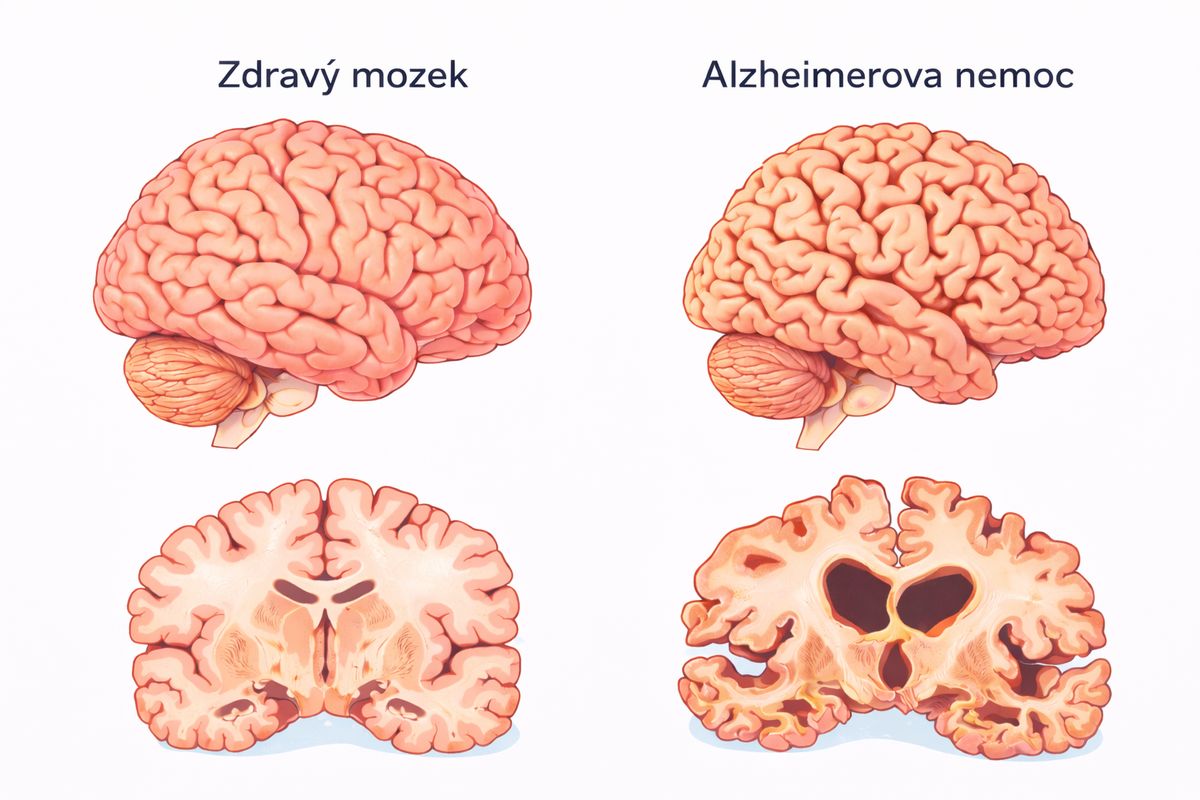 Srovnání mozku zdravého člověka a pacienta s Alzheimerovou chorobou.