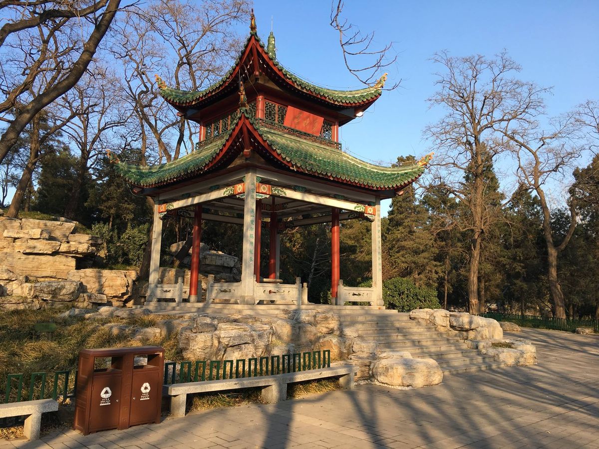 Jeden z mnoha pavilonů v pekingském parku Taoranting, v zimě.