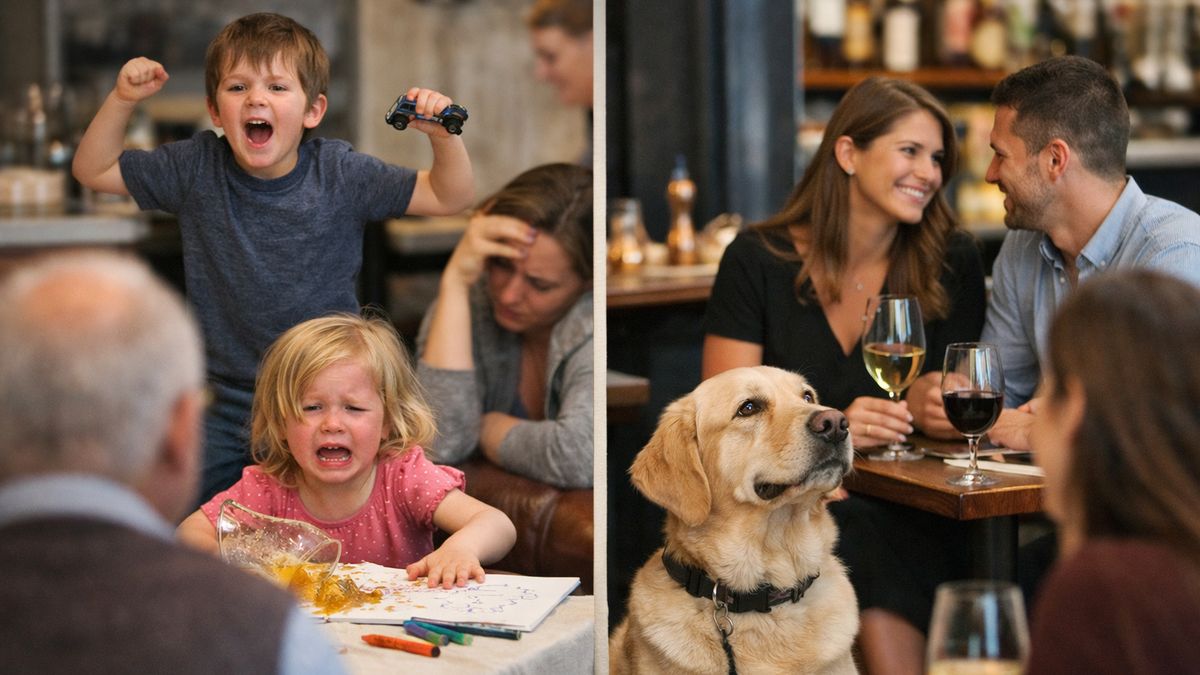Velmi trefným a paradoxním srovnáním je v tomto kontextu přítomnost psů. Nad tím, že do podniku smí vstoupit čtyřnohý mazlíček, se někteří lidé stále pohoršeně pozastavují, přitom realita v provozu bývá často opačná. Pes většinou poslušně leží pod stolem a nikdo o něm neví. Personál v anonymních diskusích často přiznává, že „pejskaře“ mají raději – a opravdu nejde jen o bordel, který děti nechají, ale majitelé psů bývají ukázněnější hosté, kteří si jdou jídlo opravdu užít. A samozřejmě pes na volno také nemá v restauraci co dělat. Jedna diskutující napsala- „Když můj pes v restauraci jednou štěkne, všichni se ohlédnou a já se propadám hanbou. Když tam cizí dítě hodinu vříská, matka se na mě ještě osopí, proč se tak blbě koukám.“