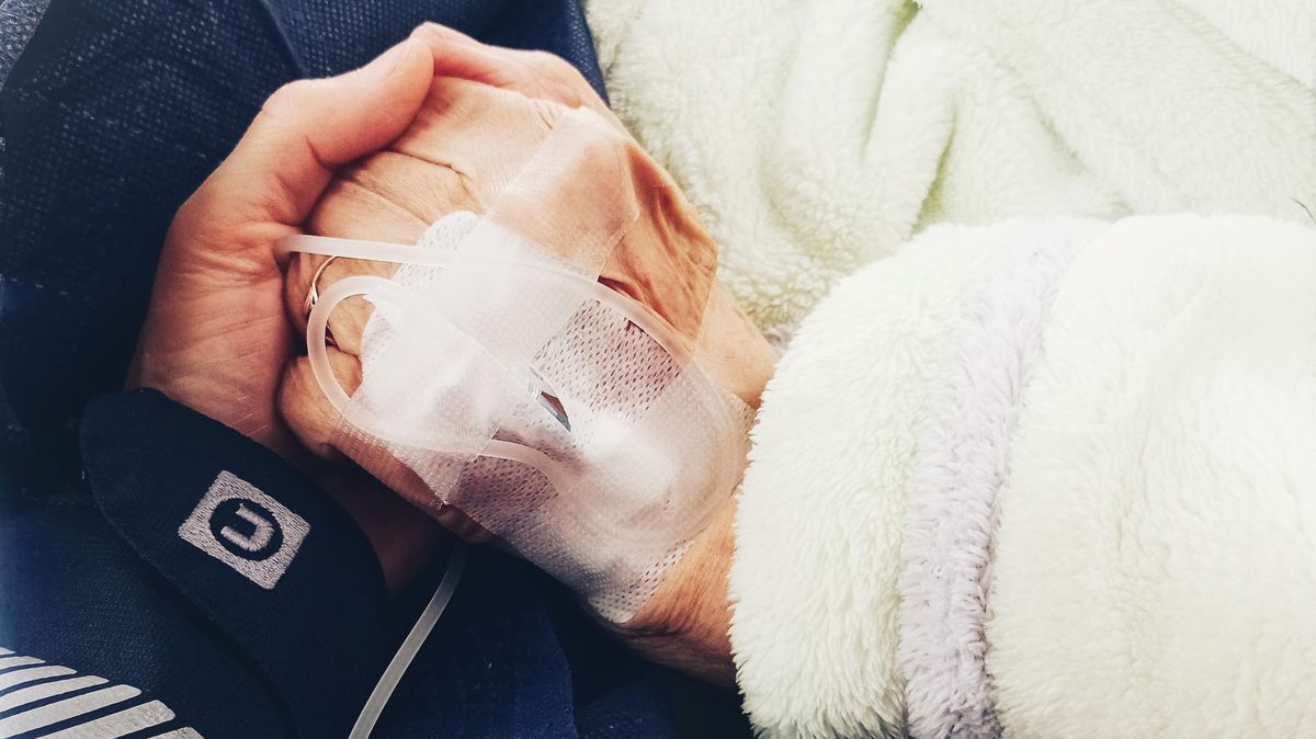 Umírající stará paní. Doma. Dýchání už jen mělké. Ruce studené.