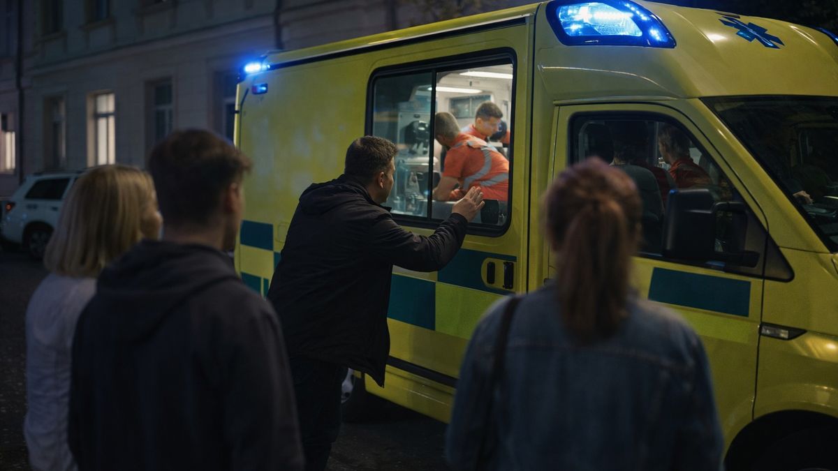 Sanitka stojí před domem. Modré světlo se odráží od oken a pravidelně osvětluje ulici. Dveře vozu jsou zavřené. Uvnitř pacient a záchranáři. Minuty běží.
