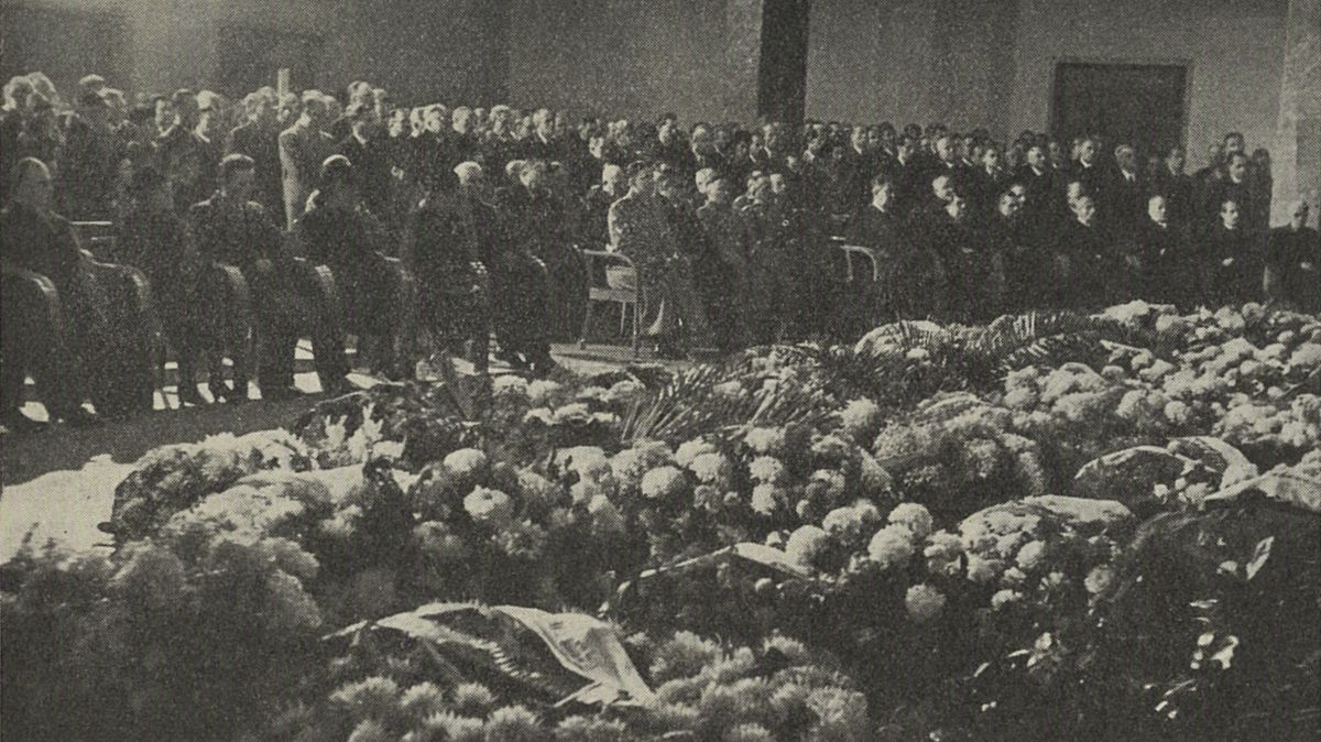 Patnáctého října 1941, slunečné dopoledne, se už od rána začaly k branám Strašnického krematoria slévat davy lidí. Měli demonstrovat oddanost Říši. Všichni prominenti protektorátu byli přítomni. Reinhard Heydrich, který teprve před třemi týdny přijel do Prahy jako nový zastupující říšský protektor, poslal věnec.