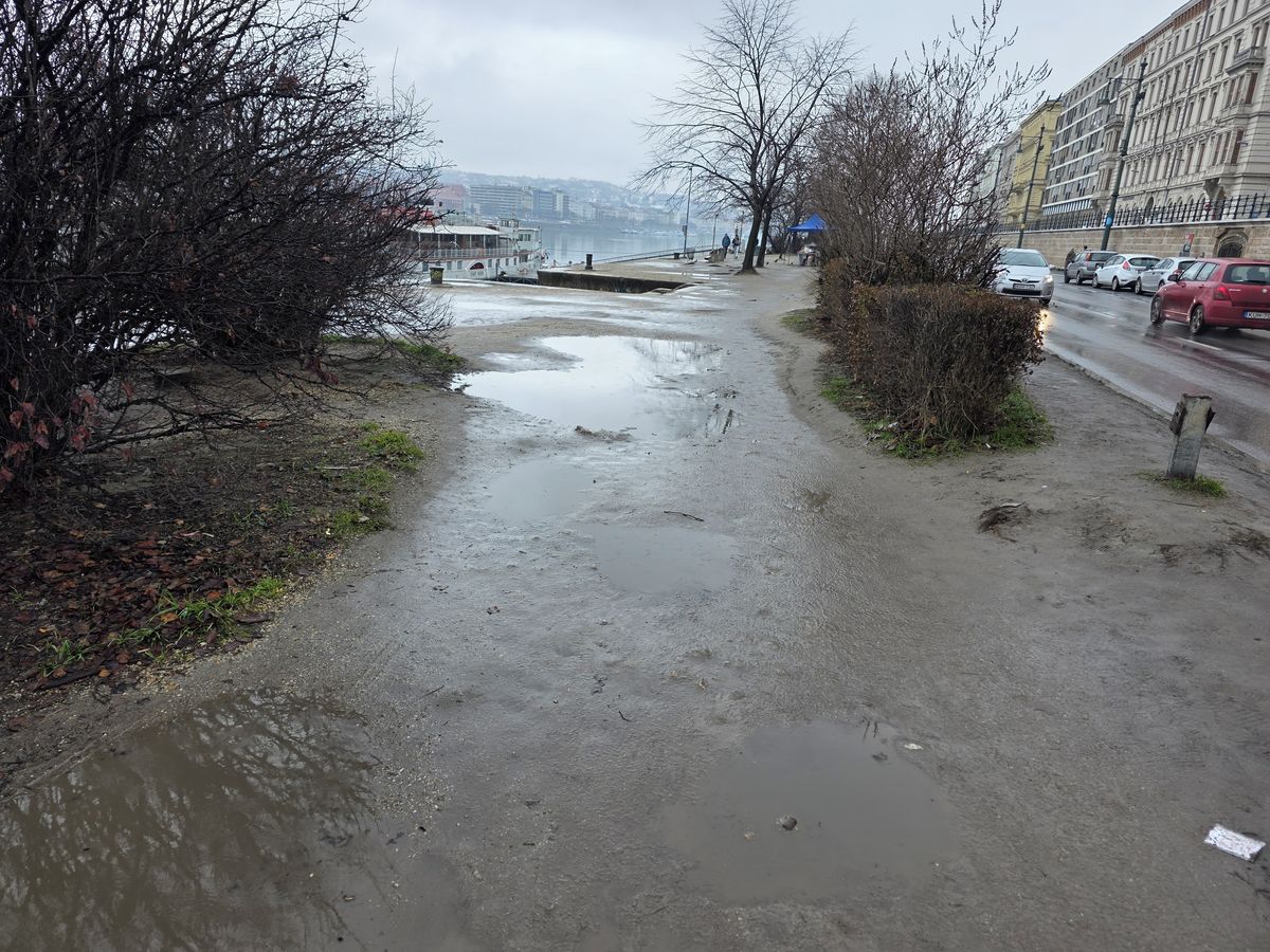 V Praze Náplavka, v Budapešti spíše bláto a a kaluže. Hned vedle nás je Dunaj, ale po dešti to není moc malebná procházka