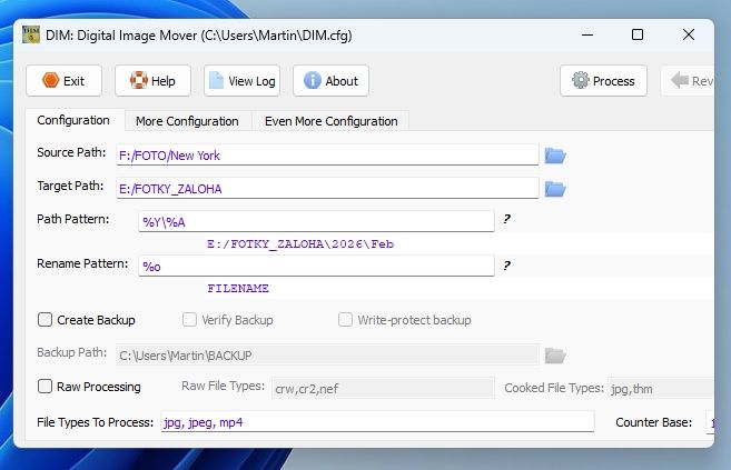 Jakmile máte konfiguraci uloženou (tlačítko „Save“), můžete stisknutím klávesy „Process“ zpracovat data ze zdrojového do cílového úložiště. Čím více máte samostatně rozesetých fotografií, tím více času to zabere, ale kopírování můžete samozřejmě nechat běžet na pozadí a počítač používat zcela normálně.